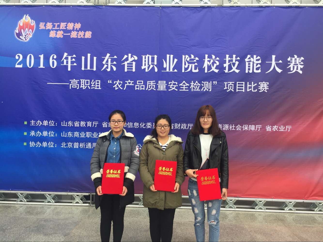 11月11日-11月14日,由山东省教育厅、山东省经济和信息化委员会、山东省财政厅、山东省人力资源社会保障厅、山东省农业厅共同主办,山东商业职业技术学院承办的第一届山东省“农产品质量安全检测”大赛在山东商业职业技术学院举行。来自全省的16个高职院校代表队参加了比赛,经过激烈角逐,我院代表队获得团体二等奖的好成绩。