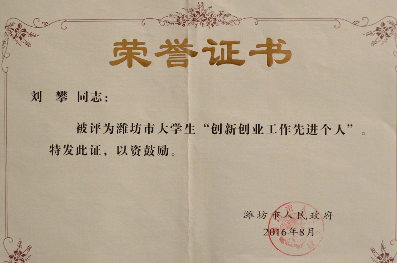 近日,潍坊市人民政府办公室公布了潍坊市人民政府关于表彰潍坊市大学生创新创业工作先进集体、先进个人和大学生十大创业之星、优秀大学生创业者的通报(潍政字【2016】30号)。我院大学生创新创业教育中心教师刘攀被授予“潍坊市大学生创新创业先进个人”称号,充分肯定了我院大学生创新创业的工作成绩。