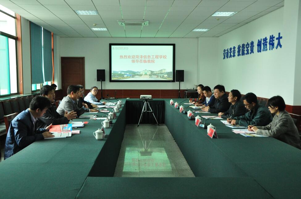会上,王守庆同志对客人的来访表示热烈欢迎,对我院基本情况进行了简单介绍。马飞同志介绍了近年来菏泽信息工程学校的办学历史及成果,表示希望双方深入交流、加强合作,并就“3+2”合作的有关专业等事宜进行了深入交流。双方还共同观看了我院名校建设汇报片。
