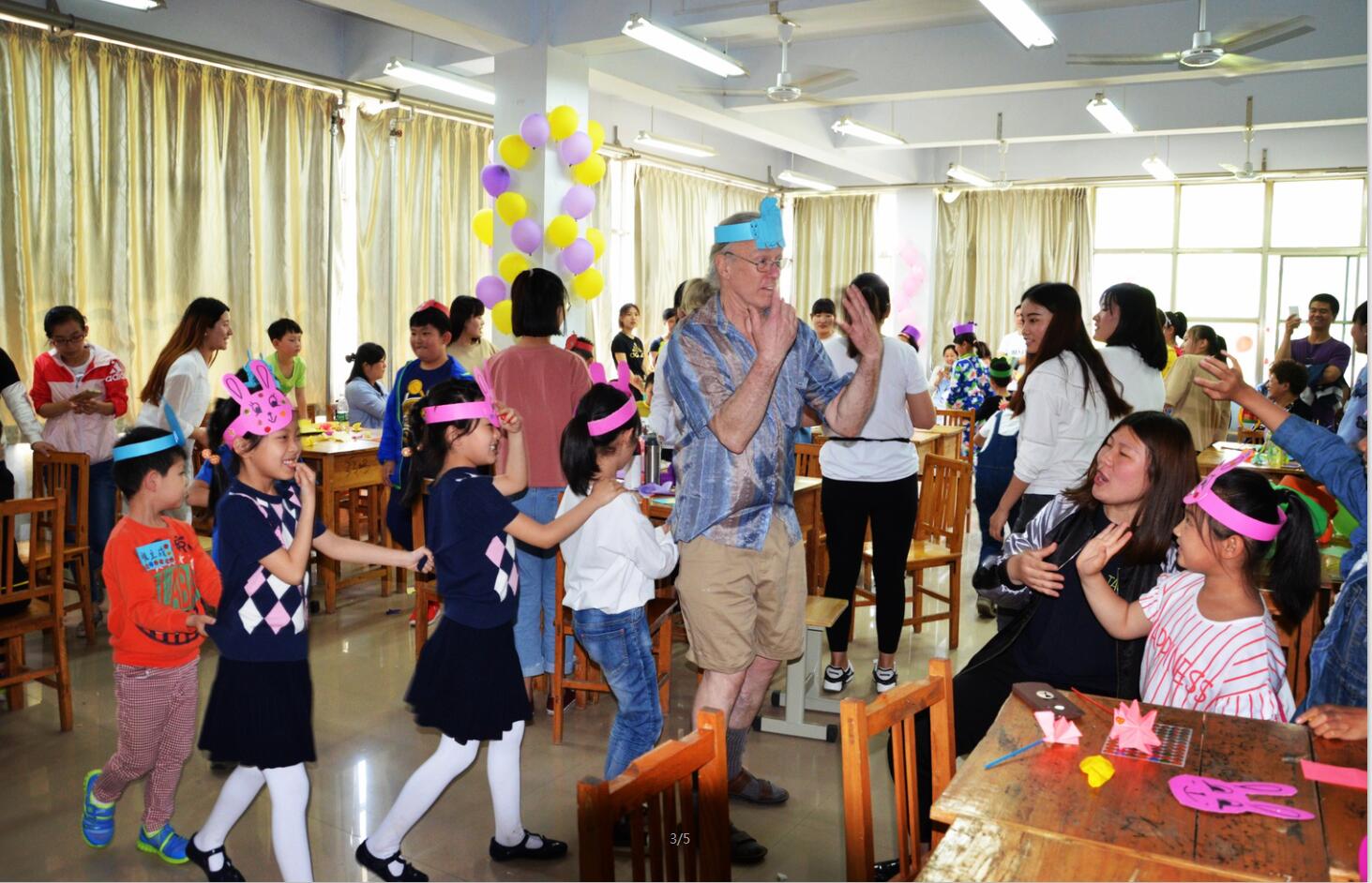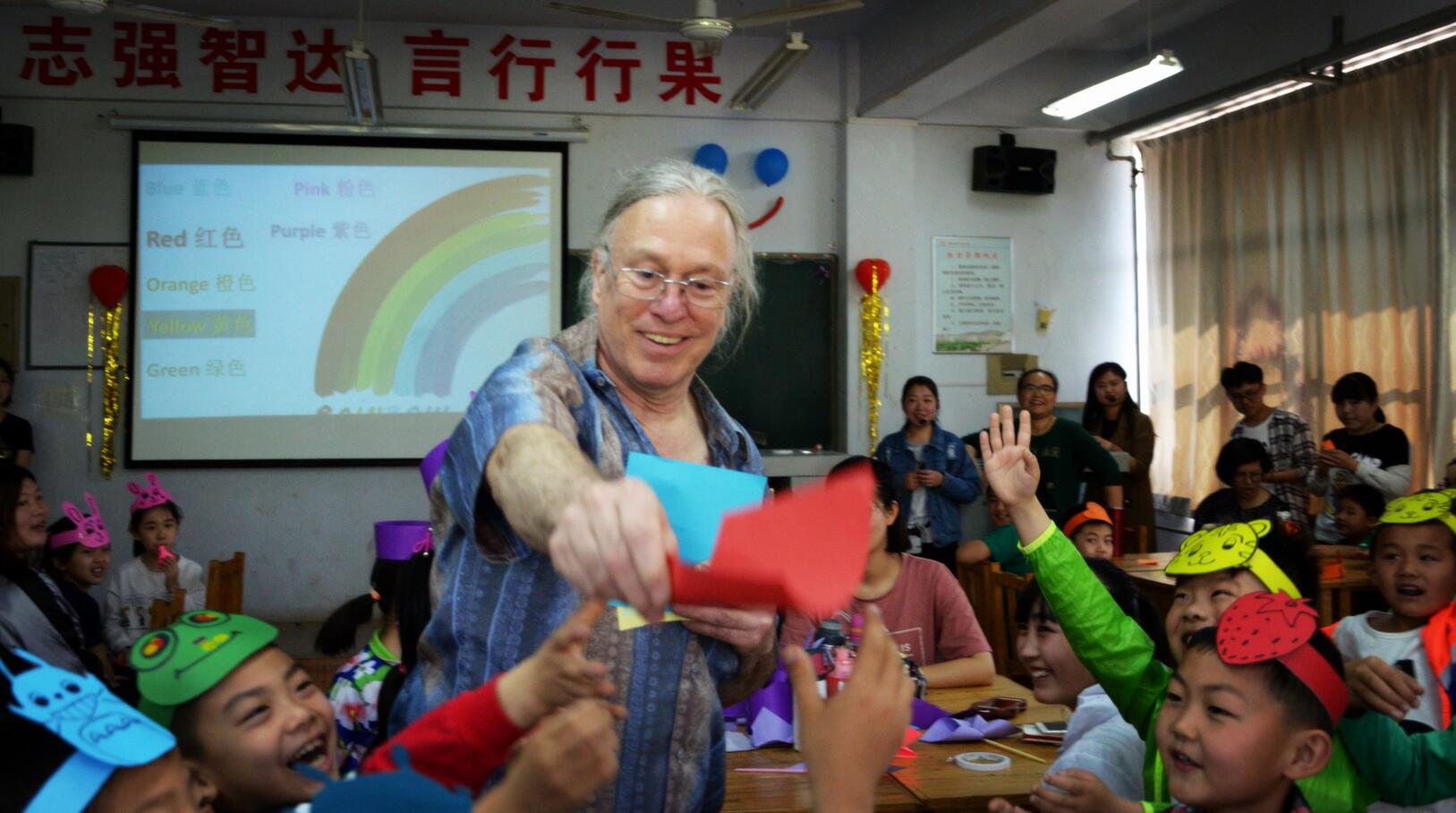本次活动由我院英语外教和英语教育专业2015级部分学生参与,让小朋友们零距离接触外教,用英语与外教进行简单交流。本次活动面向我院教职工和学院周围社区居民子女,共有35名小朋友报名参加。体验课程以“五彩缤纷的生活”为主题,通过一系列的活动让学生掌握关于颜色的英语单词和打招呼英语用语,授课分为四个环节:第一环节是外教与小朋友们互动,学习、使用打招呼英语用语;第二环节是授课教师带领小朋友们学习关于颜色的英语单词和句型,并通过一系列练习形式让学生学会应用;第三环节是通过折纸活动,让学生了解“母亲节”的西方文化;第四环节是通过开展“小火车”和“夹球接力跳”两个游戏让学生复习打招呼用语和关于颜色的英语单词。