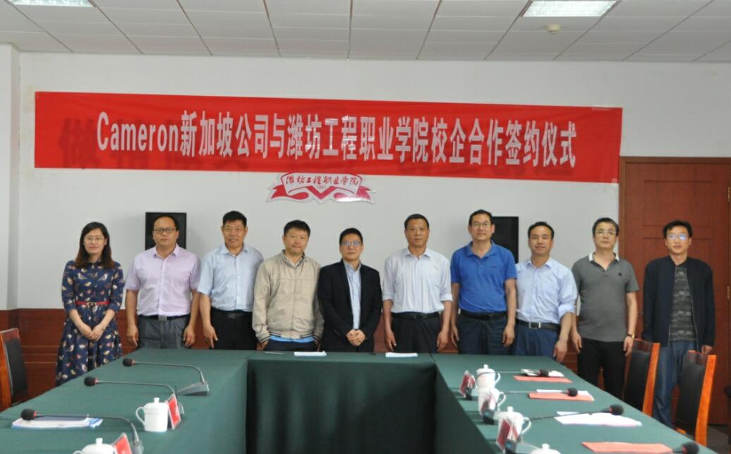 5月17日上午,我院与Cameron(卡麦隆)新加坡公司举行校企合作签约仪式。学院副院长韩振华、Cameron(卡麦隆)新加坡公司招聘经理SIENG ENG GUAN(盛勇源)分别代表校企双方签订了联合办学协议,合作共建卡麦隆新加坡高端就业班(数控技术专业)。企业代表及学院外事办、山工机电工程学院负责人参加仪式。