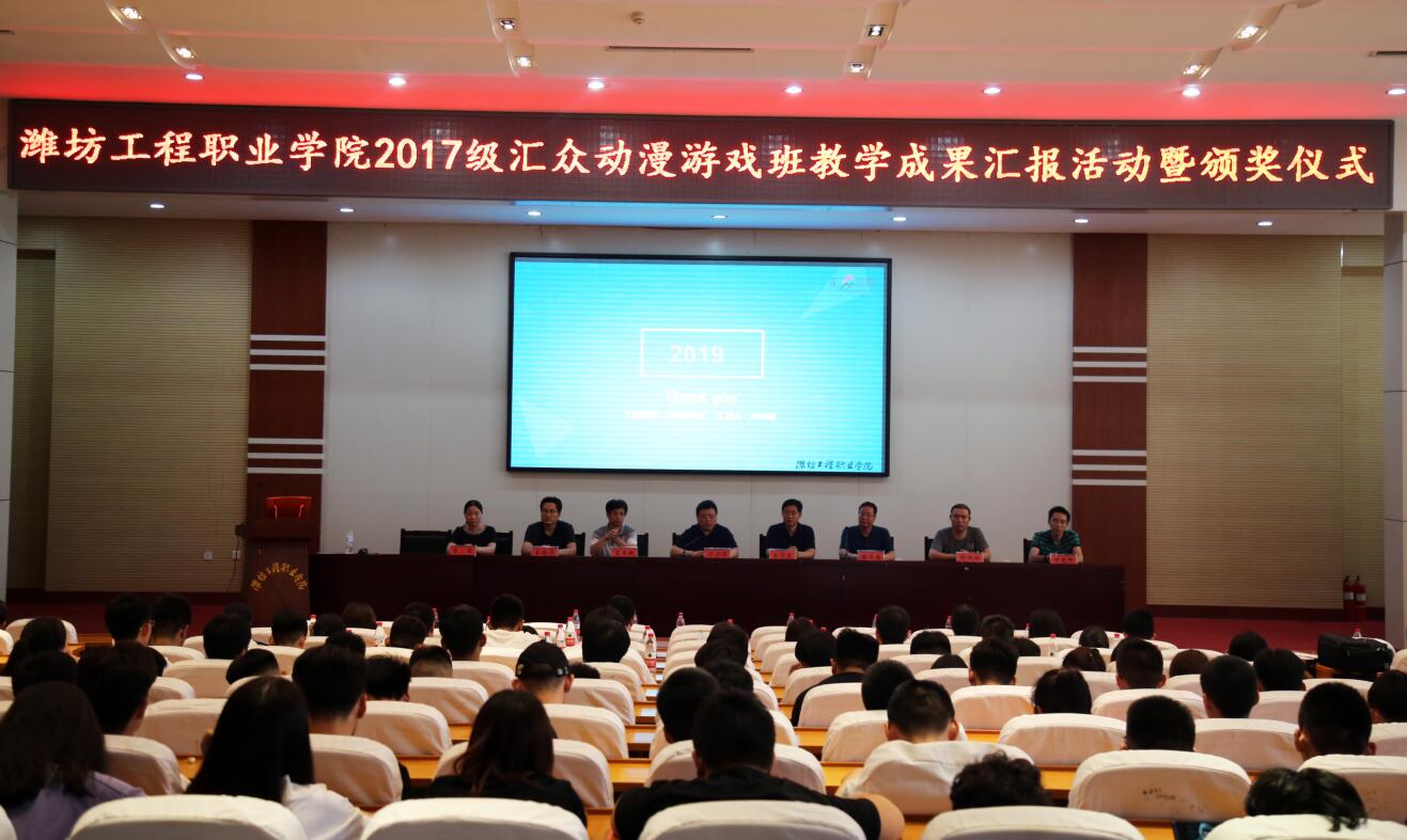 6月19日下午,我院信息工程系与北京汇众益智科技有限公司校企合作成果展示汇报暨表彰大会在学术报告厅隆重举行。副院长王守庆、北京汇众益智院校副总裁宁少华、北京汇众益智全国教学经理伊光辉、信息工程系主要负责同志以及全体教师、北京汇众益智驻我院全体讲师、校企共建计算机应用技术专业(动漫游戏方向)2017级2018级全体同学出席本次汇报会。