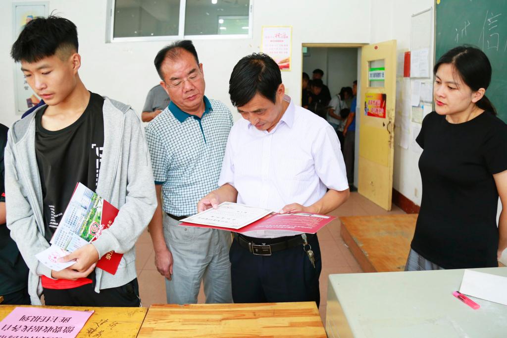王金明实地察看了新生报到处,详细了解了新生报到流程及新生报到情况,然后依次来到缴费处、停车场、餐厅、学生公寓等地方,对方便学生缴费、送学生车辆的停放调度、学生用餐的安全和质量、学生住宿条件的改善等方面提出了具体要求;在实地查看了教学楼教室新换装的门以后,他对中专部近年来在基础设施提升改造方面做的努力给予了肯定。他向在一线开展迎新工作的人员了解了迎新工作的落实细节,对中专教学部热情、周到、细致的迎新服务工作表示肯定。