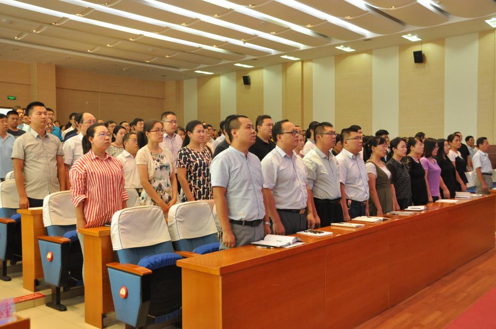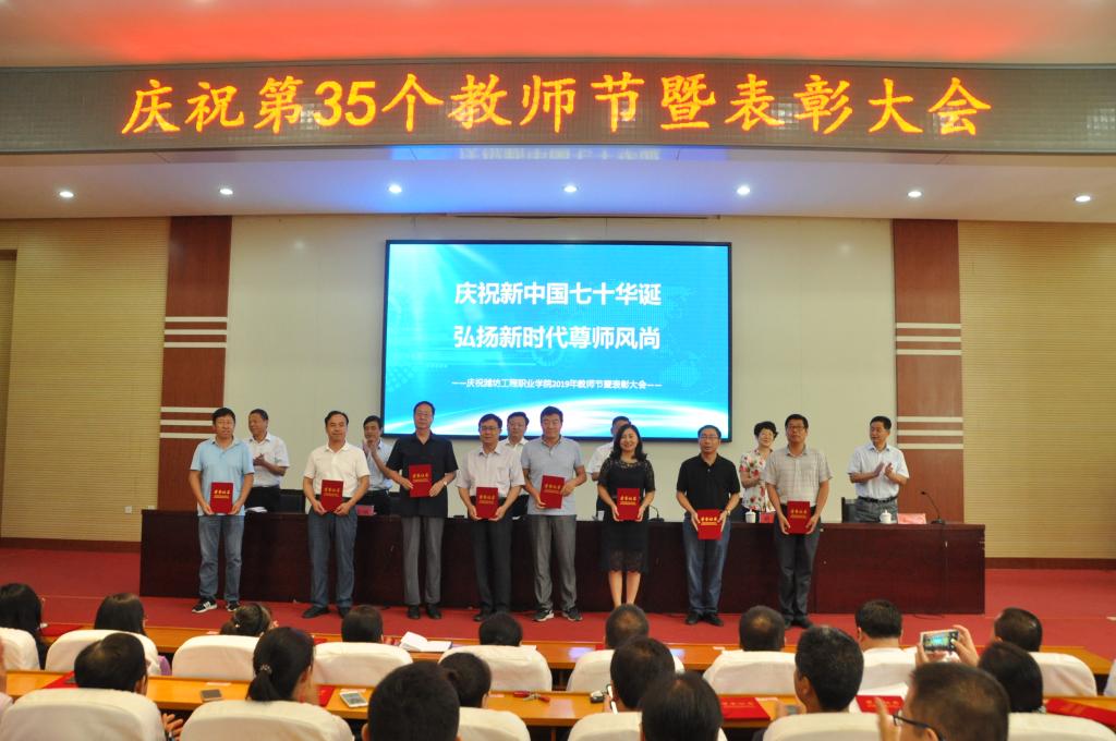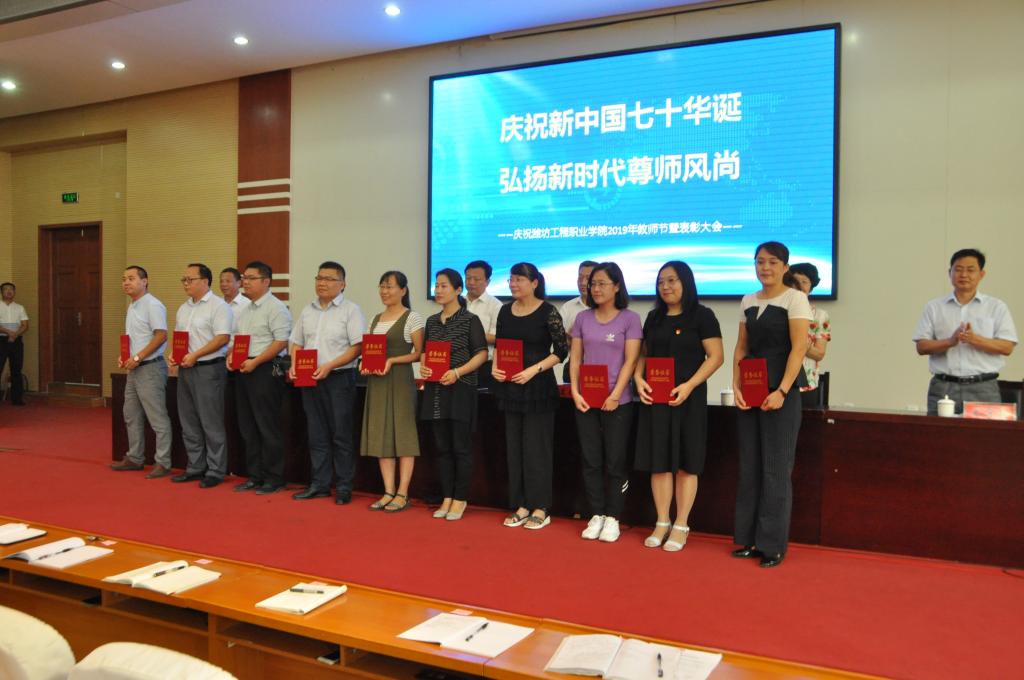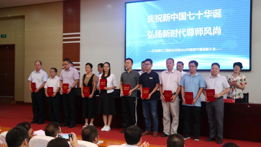 在雄壮的国歌声中,表彰大会拉开了帷幕。王金明宣读了关于表彰师德标兵、优秀教师、优秀教育工作者、优秀辅导员的决定,王守庆宣读了关于表彰奖励2018-2019学年教学工作先进单位和先进个人的决定。院领导为获奖集体和个人颁发了荣誉证书。