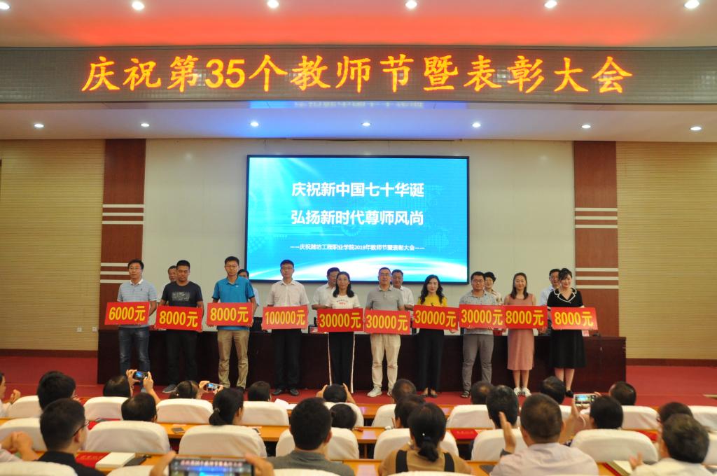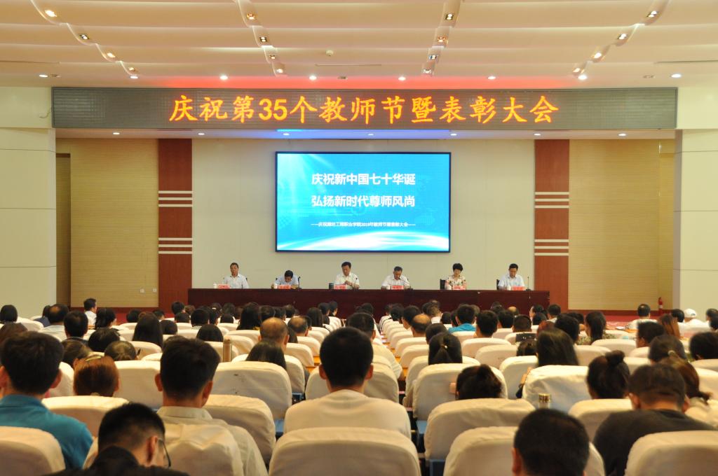 庆祝新中国七十华诞,弘扬新时代尊师风尚。9月9日,我院全体教职工在学术报告厅欢聚一堂,共同庆祝第35个教师节,隆重表彰在学院建设和发展中涌现出来的师德标兵、优秀教师、优秀教育工作者、优秀辅导员、教学工作先进单位和先进个人。党委书记肖明胜、院长高立伯、副院长王金明,纪委书记那菊华、副院长韩振华、副院长王守庆出席会议。会议由高立伯主持。