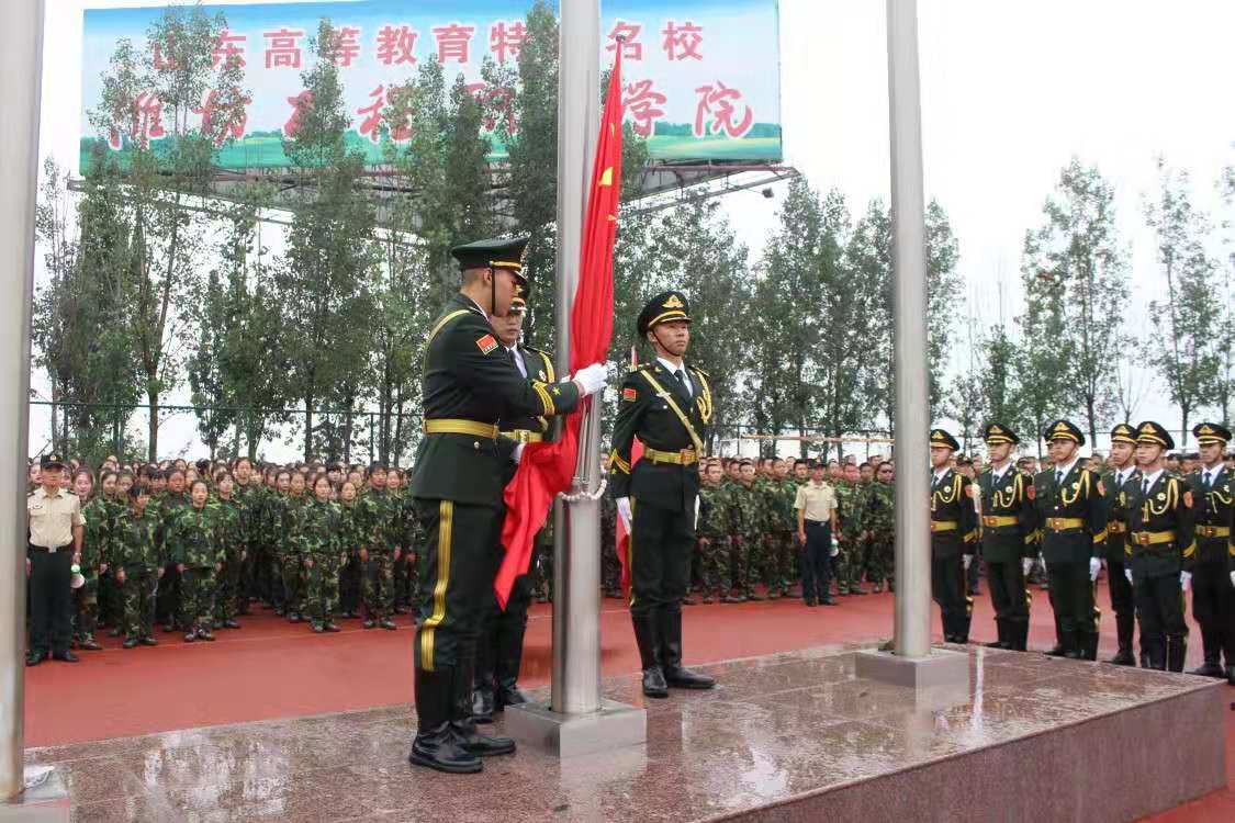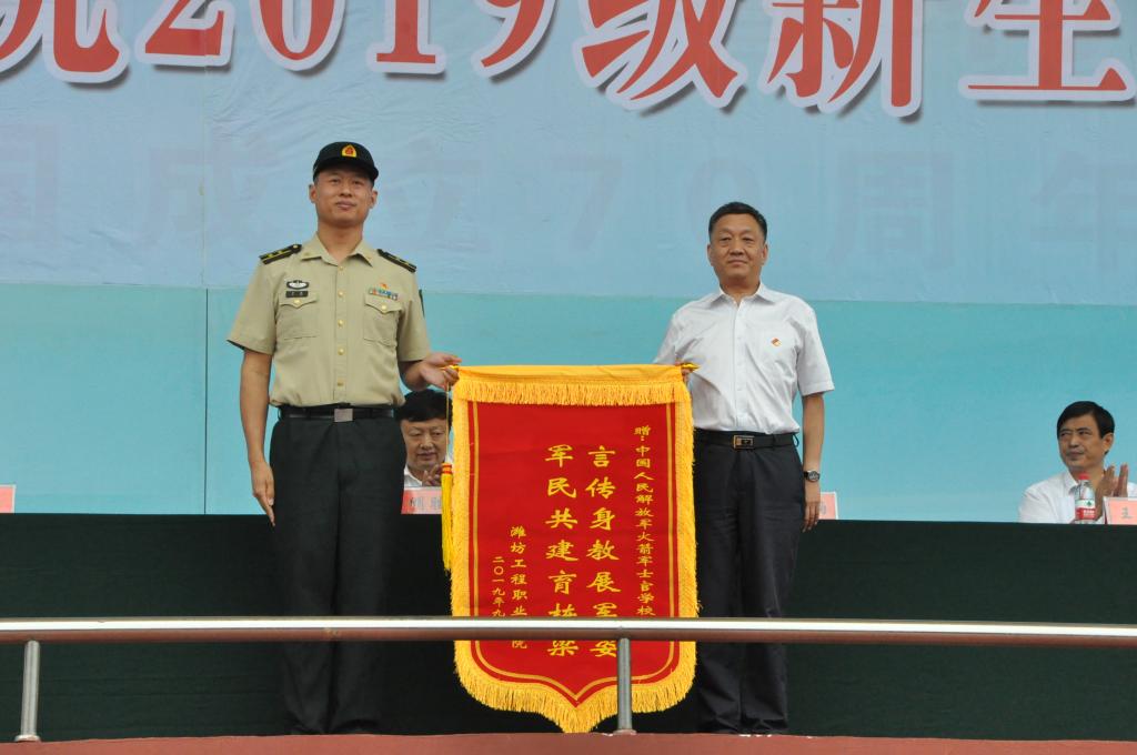 9月12日上午,我院2019级新生军训总结大会在操场隆重举行。学院党委书记肖明胜、院长高立伯、中国人民解放军某部首长于亮,副院长王金明、纪委书记那菊华、副院长韩振华在主席台就坐,军训教官、各系院中层干部、教师代表和2019级全体新生参加了会议。会上,肖明胜同志发表讲话,高立伯同志代表学院向帮训部队赠送锦旗。大会由韩振华主持。
