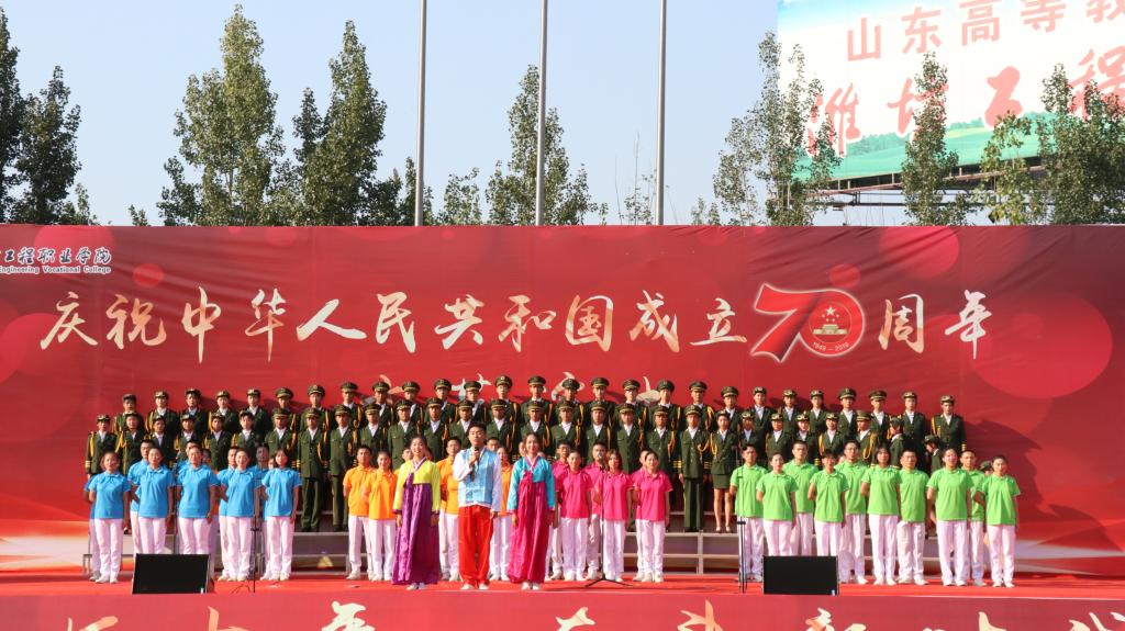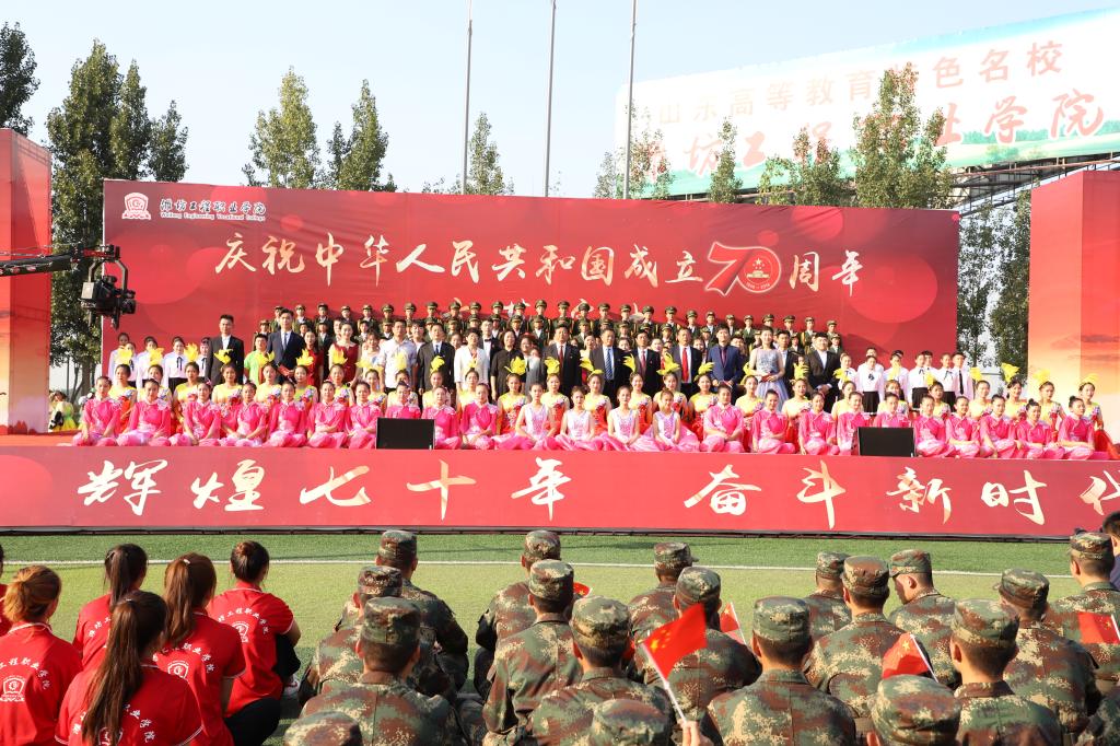 9月26日下午,我院在南校区运动场隆重举行庆祝中华人民共和国成立70周年启动仪式暨文艺演出。我院党委书记肖明胜、院长高立伯、党委副书记李琳、副院长王金明、纪委书记那菊华、副院长韩振华、副院长王守庆,青州市文化馆副馆长李江涛出席活动并观看演出。启动仪式由高立伯同志主持。学院全体师生参加活动。
