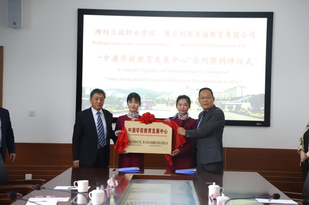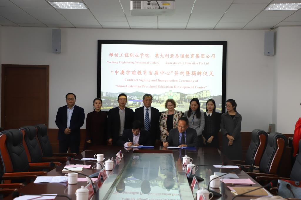 2019年11月15日上午,我院与澳大利亚易通教育集团举行校企合作签约仪式共建中澳学前教育发展中心。学院院长高立伯、副院长王金明、澳大利亚亚易通教育集团公司董事长冯光斌、澳大利亚新英格兰大学国际部主任英格丽·埃里森、企业代表、潍坊市国际交流中心代表及学前教育学院负责人参加仪式。