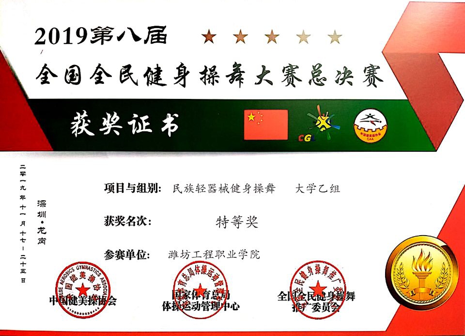 学院体操队在2019年第八届全国全民健身操舞大赛大学乙组民族轻器械健身操舞赛项中获得特等奖,另外在民族徒手健身操舞、民族健身操规定套路之傣族等赛项中分别获得了一等奖、二等奖。