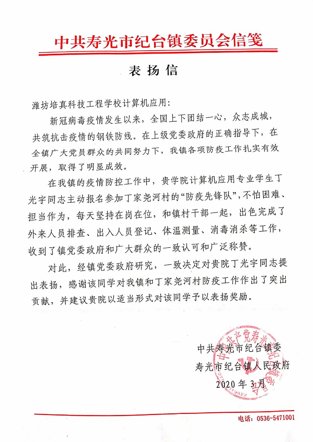近日,我院收到来自寿光市纪台镇委镇政府的一封表扬信。信中表扬了我院2019级五年一贯制计算机应用3班丁光宇同学,抗疫期间丁光宇同学作为一名志愿者,为当地的抗疫工作做出了贡献。