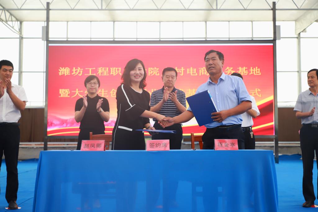 会上,潍坊工程职业学院经济管理系主任、乡村电商学院院长与青州九州农庄蔬菜专业合作社董事长签订项目合作书,潍坊市纪委市监委派驻第十纪检监察组二级调研员、高柳镇乡村振兴服务队队长李峰山的讲话围绕着贯彻省委关于乡村振兴“政治站位要高、服务发展要实、联系群众要亲、打造堡垒要强、自身要求要严”的指示精神,将思路落实到具体项目,九州农庄蔬菜专业合作社负责人程金亭介绍了农庄情况,潍坊工程职业学院党委委员组织人事处处长冯永光发表致辞并表示,乡村电商服务基地成立后,将采取“学院+基地+合作社+农户”的服务模式,派出教师服务团、科技特派员、学生爱心助农服务队等,对接企业或合作社,推行项目实战教学模式改革,师生走进合作社,地方特色农产品走进课堂,通过项目实训的方式帮助地方优势特色农产品插上互联网的翅膀,引导特色产品生产形成聚集区,打造品牌,助力农产品活力提升,使资源产品变为资源商品,实现助农与专业技能人才培养双赢。同时发挥智力与技能优势,开展多层次全方位的技术技能培训,为乡村经济发展各领域培养一线管理人才和技术技能人才。