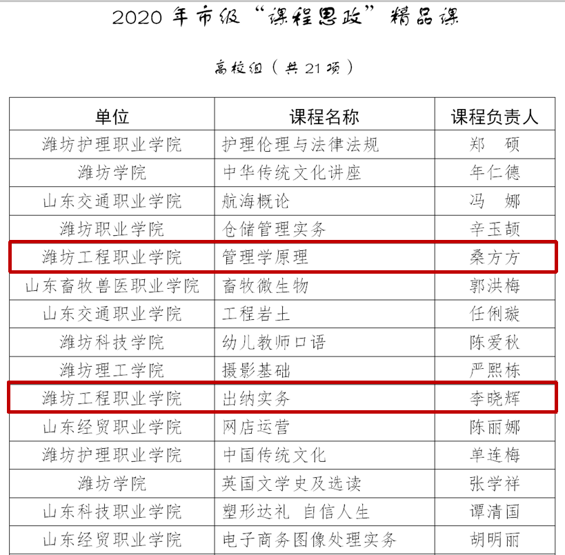 近日,潍坊市委教育工委公布了2020年市级思政课教学改革示范点项目和“课程思政”精品课名单,我院基础教学部《“三因”教学改革让思政课活起来》入选市级思政课教学改革示范点项目,桑方方主持的《管理学原理》、李晓辉主持的《出纳实务》两门课程入选市级“课程思政”精品课。