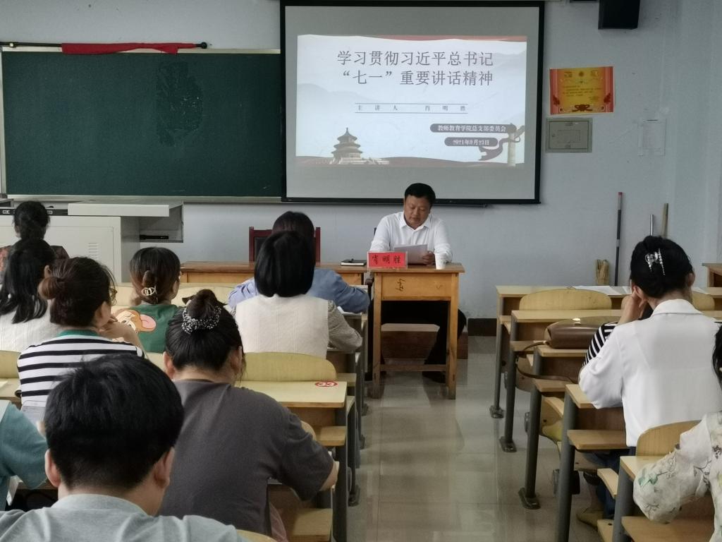 在教师教育学院第一党支部,肖明胜带领全体党员认真学习领会了总书记“七一”重要讲话精神,深入学习了实现中华民族伟大复兴中国梦的重大意义、科学内涵、现实任务,生动鲜活地讲述了中国共产党百年来创造的“四个伟大成就”、形成的“伟大建党精神”、积累的“九个必须”宝贵经验,他表示要把思想认识统一到习近平总书记“七一”重要讲话精神上,切实在学懂、弄通、做实上下功夫;要把学习习近平总书记“七一”重要讲话精神作为全党开展党史学习教育的重要内容,切实推动学习往深里走、往实里走、往心里走;要把学习习近平总书记“七一”重要讲话精神同总结经验、联系实际、推动工作结合起来,把学习的成效不断转化为工作的动力和实效。