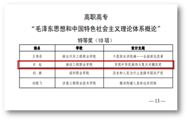 近日,山东省教育厅公布了首届全省学校思政课教学设计大赛获奖名单,我院思政课教师石钰荣获高职高专组《毛泽东思想和中国特色社会主义理论体系概论》特等奖。