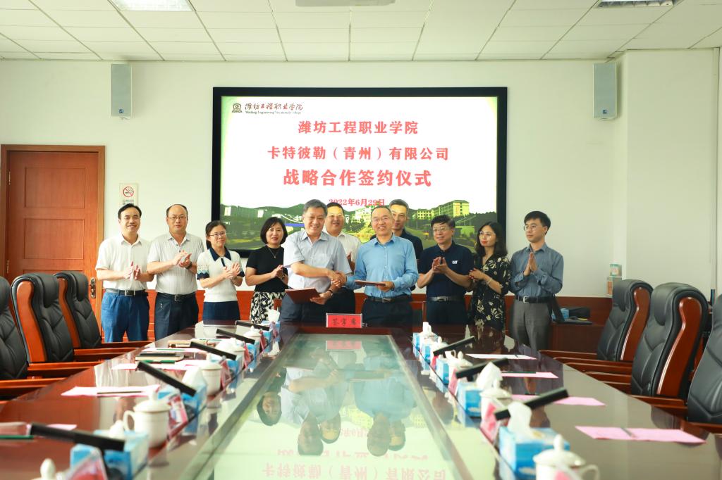 6月29日,我院与卡特彼勒(青州)有限公司合作签约仪式举行。党委副书记、院长高立伯出席签约仪式并致辞,党委委员、统战部部长兼党政办公室主任赵庆松以及卡特彼勒(青州)有限公司工厂总经理马建平等出席会议,教务处、科研产业处、机电工程学院、汽车工程系相关部门负责人参加会议,会议由赵庆松主持。