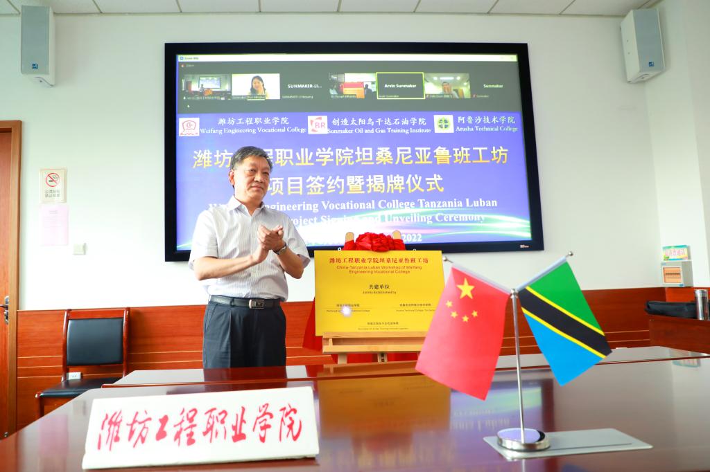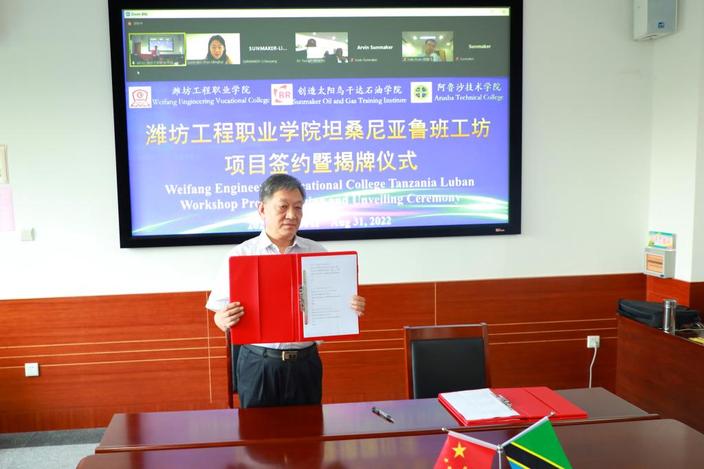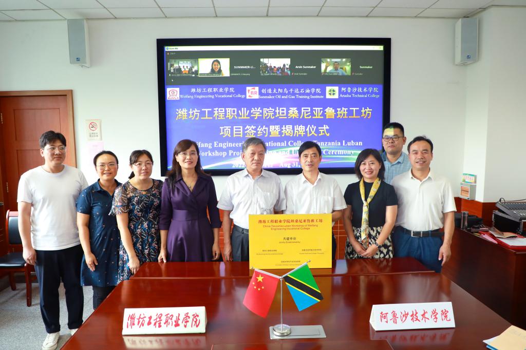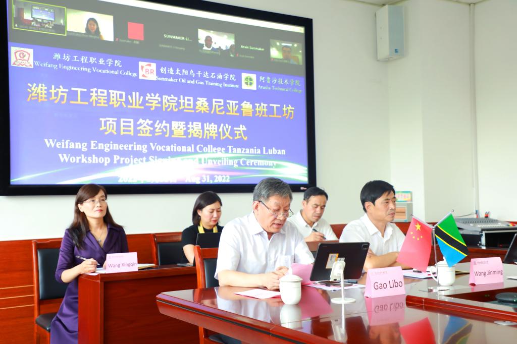 8月31日下午,潍坊工程职业学院坦桑尼亚鲁班工坊项目签约暨揭牌仪式以线上线下结合方式隆重举行。坦桑尼亚阿鲁沙技术学院校长穆萨·查查、副校长尤瑟夫·班多和创造太阳乌干达石油学院副校长段晓飞等线上参会,我院院长高立伯,副院长王金明及教务处、国际交流学院、机电工程学院相关人员线下参会。