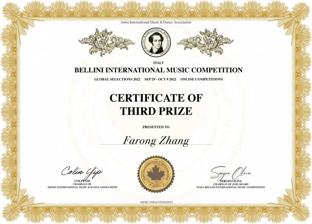 9月29—10月9日举行的2022意大利“贝利尼”国际音乐比赛环球选拔赛(线上比赛)中,凤凰艺术学院教师张发荣博士获得三等奖。