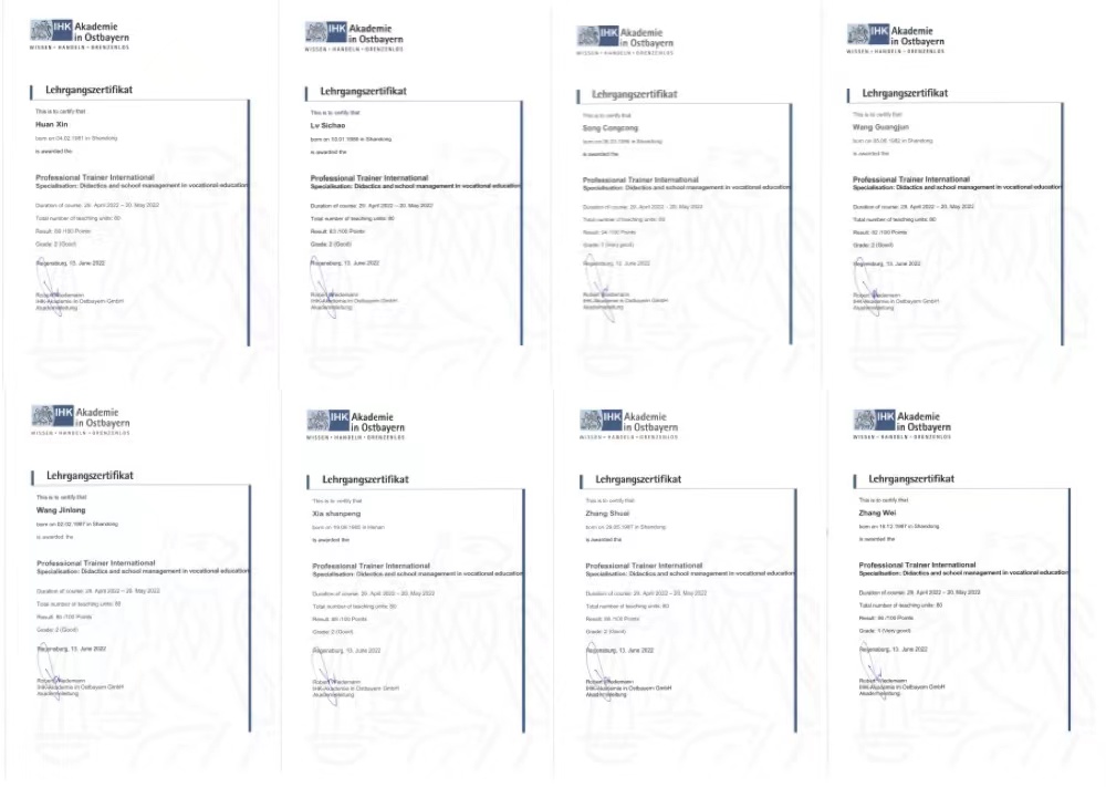 近日,我院专业骨干教师郇新、吕思超、宋从从、王广军、王金龙、夏山鹏、张帅、张炜通过了德国工商业联合会(IHK)“国际职业培训师”认证,正式获得了国际职业培训师证书。
