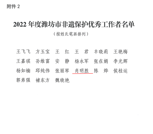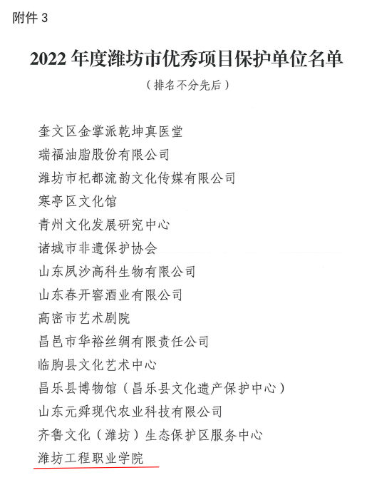 1月19日,潍坊市文化和旅游局发布了《关于表扬2022年度潍坊市非遗保护年度人物优秀工作者和优秀项目保护单位的通报》,学院被评为“2022年度潍坊市优秀项目保护单位”,党委书记肖明胜被评为“2022年度潍坊市非遗保护优秀工作者”。