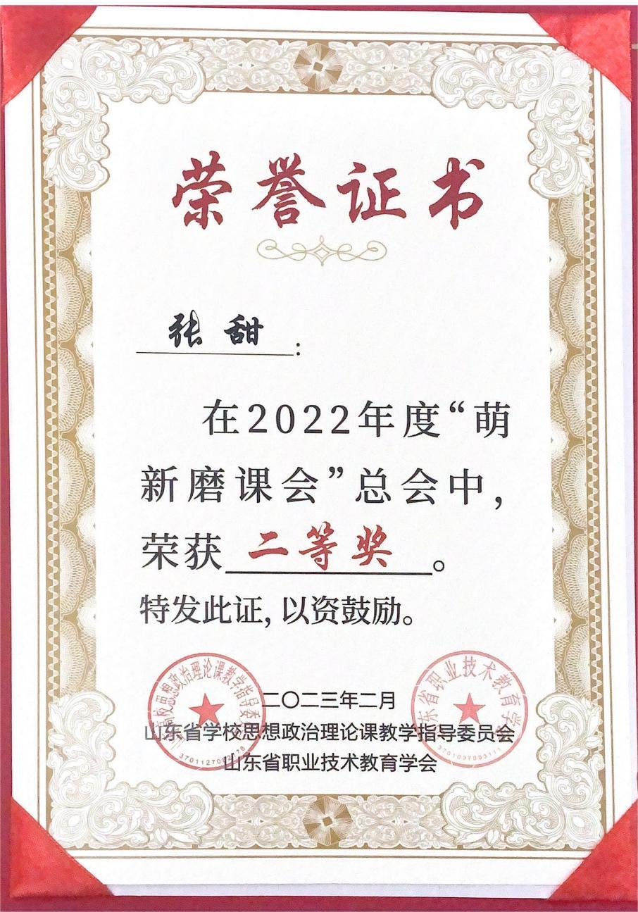 此次“萌新磨课会”是由山东省教育厅指导,山东高校思想政治理论课教学指导委员会主办,面向入职思政课教师岗位3年之内、年龄在35岁以下的青年思政课教师开展的教学展示项目。2022年山东省5大片区萌新磨课会推选出的10名优秀选手参加了“萌新磨课总会”高职组比赛,马克思主义学院思政课教师张甜在2022年第五场“萌新磨课会”高职组中,以(高职)第一名的成绩进入初赛并进行了现场展示,经激烈角逐,最终张甜老师获2022年度山东省“萌新磨课总会”高职高专组二等奖。