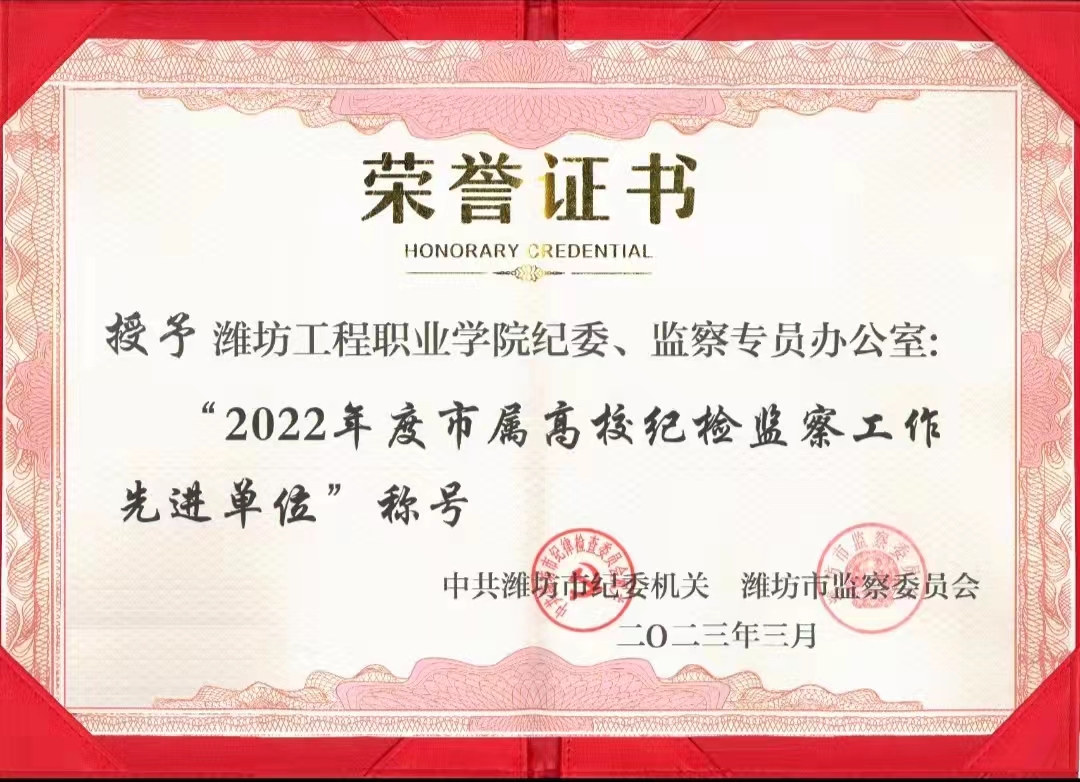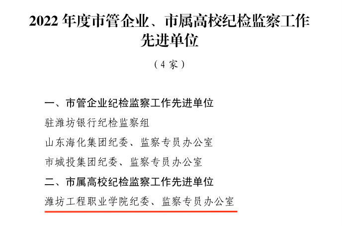 3月10日,潍坊市纪委监委召开全市纪检监察系统总结表扬大会,我校纪委(监察专员办公室)被表彰为“2022年度市属高校纪检监察工作先进单位”,是唯一一所获此荣誉的市属高校。