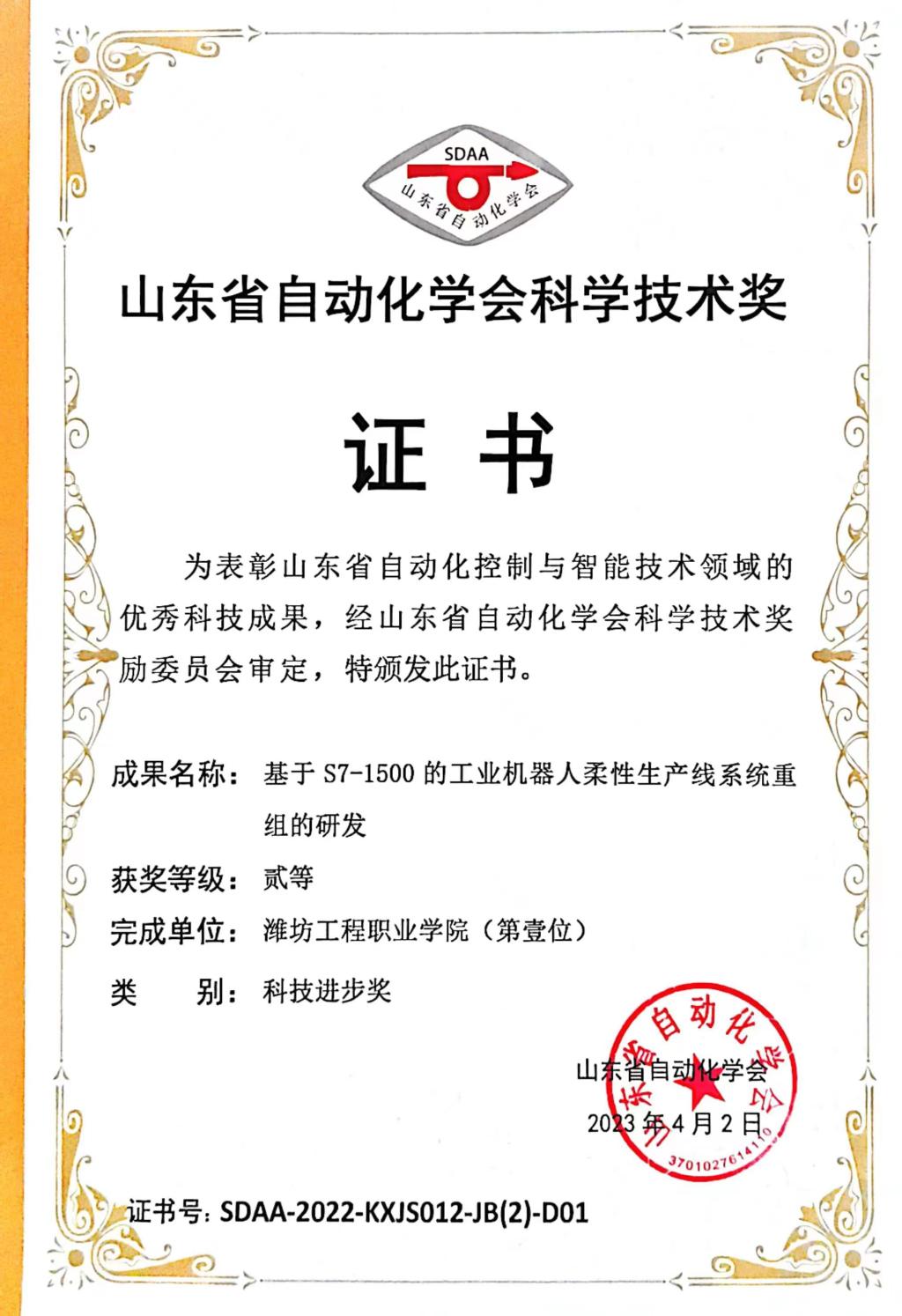 山东省自动化学会科学技术奖每年度评审一次,包括自然科学奖(张嗣瀛奖)和科技进步奖。2022年授奖项目总数为12项,我校是唯一获奖的高职院校。