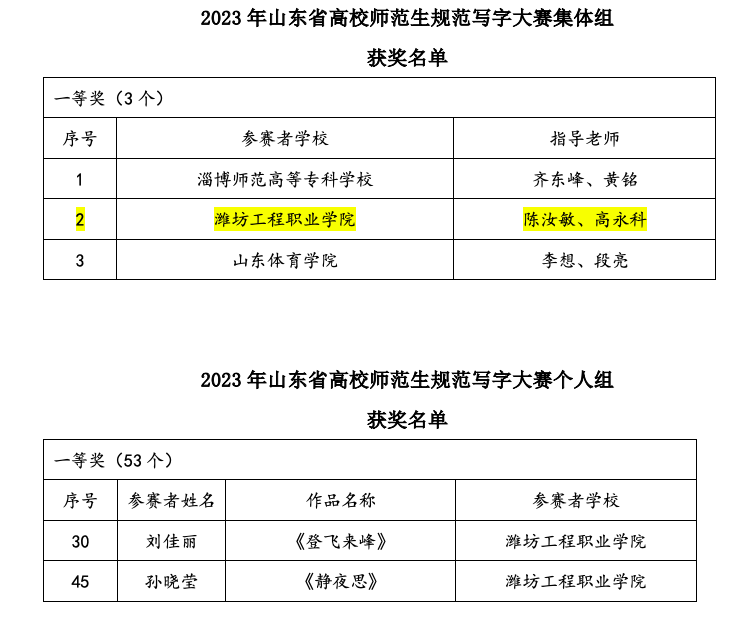 近日,山东省教育厅、山东省语言文字工作委员会公布了2023年山东省高校师范生规范写字大赛的获奖名单,我校荣获集体组一等奖,教师教育学院学生荣获一等奖2项、二等奖13项、三等奖14项。