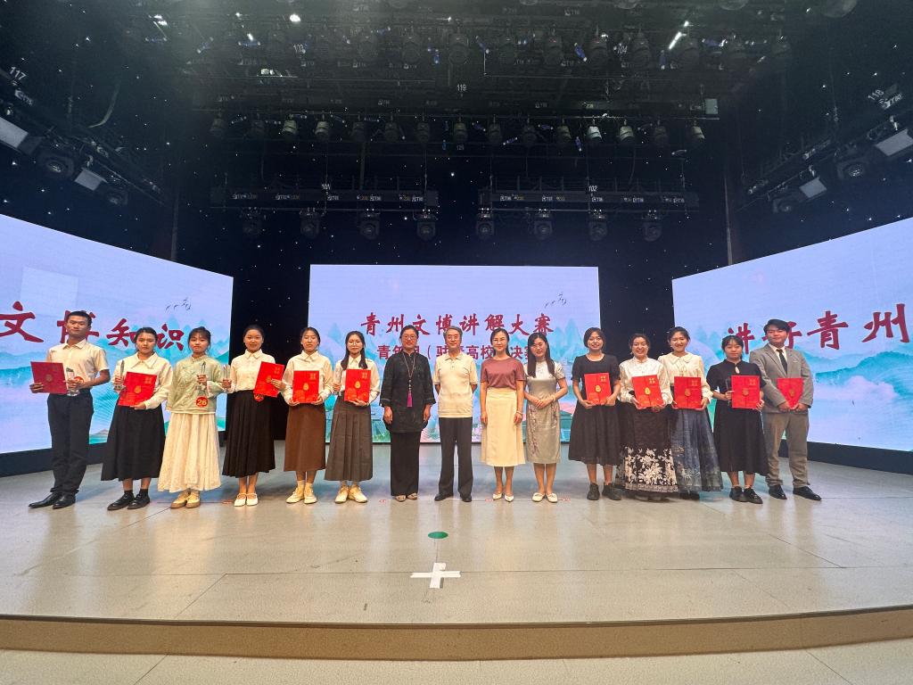 近日,由青州市委宣传部、青州市委教育工委主办,青州市融媒体中心组织举办的青州市“文博”讲解大赛青年(驻青高校)决赛在市融媒体三楼演播厅举行。经初赛选拔,我院12名选手成功入围决赛。在决赛现场,我院选手各展风采,巧妙运用音乐、视频等辅助方式,紧扣文物的文化内涵与特色,以生动的语言讲述了文物背后的故事。经过激烈角逐,我院学生斩获4金3银2铜3优秀奖。