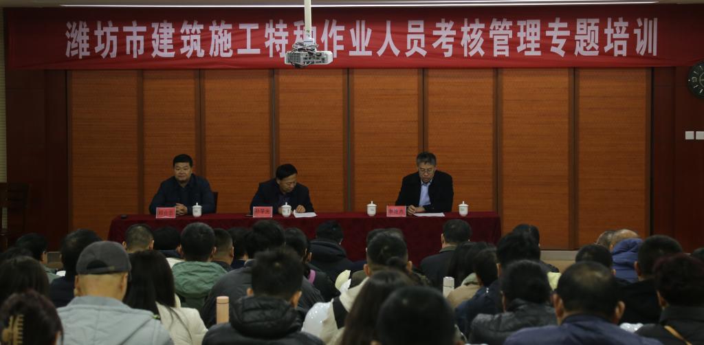 3月14日上午,由潍坊市住房和城乡建设局主办、潍坊市建筑业发展服务中心和潍坊工程职业学院建筑工程培训中心承办的潍坊市建筑施工特种作业人员考核管理专题培训班举办,市建筑业发展服务中心副主任孙学光、安全监督检查一科科长单连杰出席培训班并讲话。市住建局质量安全监管科负责人,市建筑业发展服务中心全体安全监管人员,奎文区、潍城区等市区安全监管人员,各特种作业教育培训机构教师等100余人参加培训。