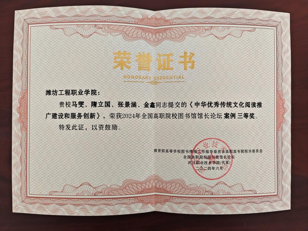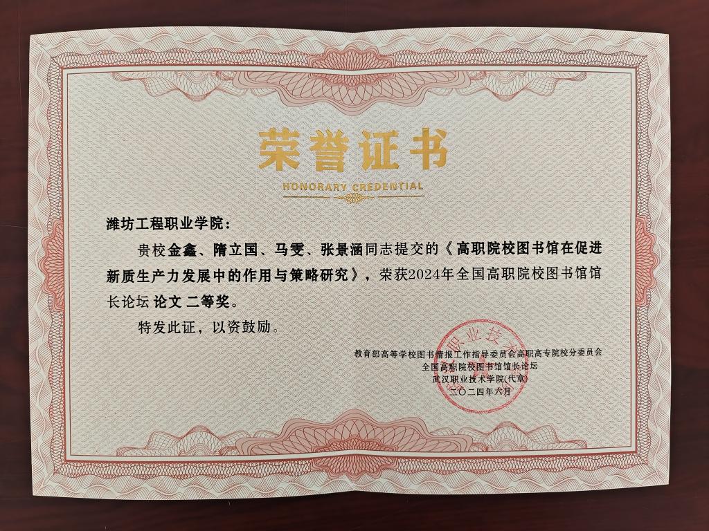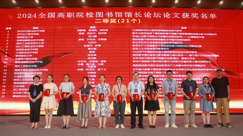 近日,在由教育部高等学校图书情报工作指导委员会高职高专院校分委员会组织开展的2024年全国高职院校图书馆馆长论坛案例与论文征集活动中,我院教师提交的论文《高职院校图书馆在服务新质生产力发展中的作用与策略研究》获论文类二等奖、案例《中华优秀传统文化阅读推广建设和服务创新》获案例类三等奖。