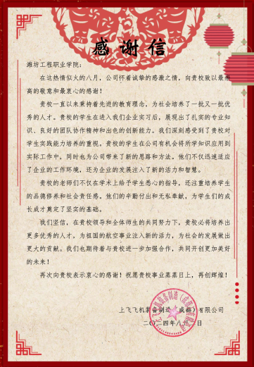 8月2日,岗位实习单位上飞飞机装备制造(成都)有限公司向我院发来感谢信,对学院一直以来给予企业的帮助和人才支持表达衷心的感谢。