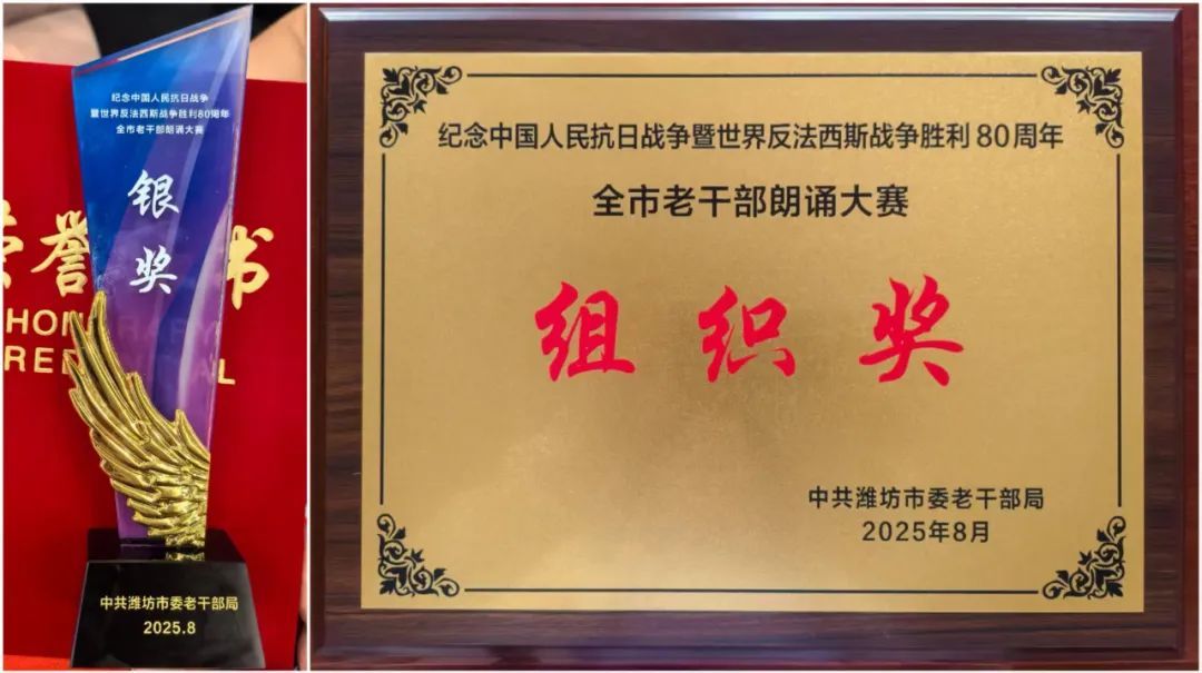 8月26日,由潍坊市委老干部局主办的“纪念中国人民抗日战争暨世界反法西斯战争胜利80周年”全市老干部朗诵大赛在潍坊市老年大学举行。学院选送的朗诵作品《不朽的抗战》获银奖,学院获组织奖。