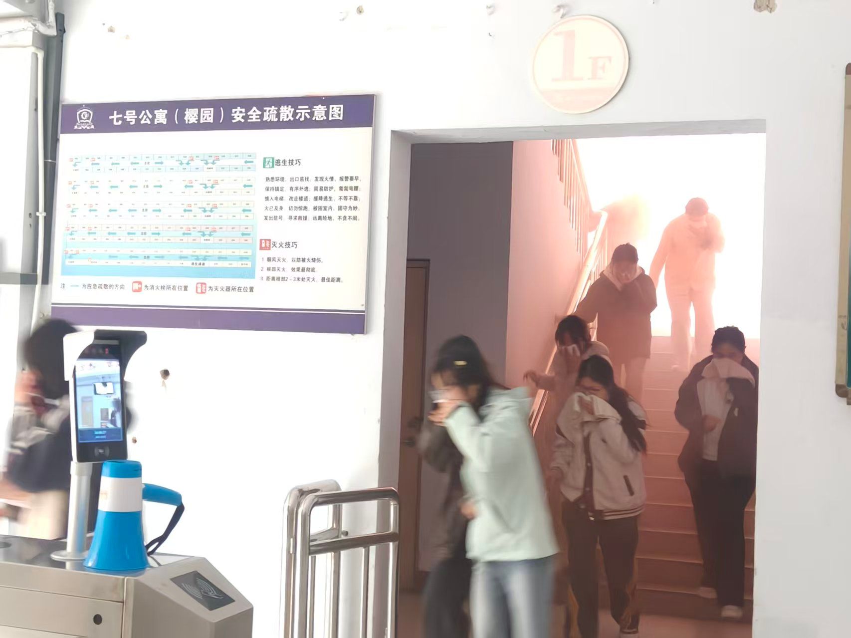 下午4时,随着地震预警哨声的响起,演练正式拉开序幕。学生立即采取避险姿势,躲到桌下或承重墙墙根位置,降低身体重心,用被子、枕头等护好头部,待第二次逃生指令发出后,学生们按照既定逃生路线迅速撤离至户外空旷区域。消防应急演练中,学生利用湿毛巾捂住口鼻,在安全员的指挥下,沿着预定逃生路线,弯腰快速向公寓楼外集合点疏散。演练过程中无拥挤、推搡现象。演练结束后,学生工作处相关负责人对本次演练过程进行总结;安全保卫处工作人员现场演示了灭火器的正确使用方法,学生进行现场演练。