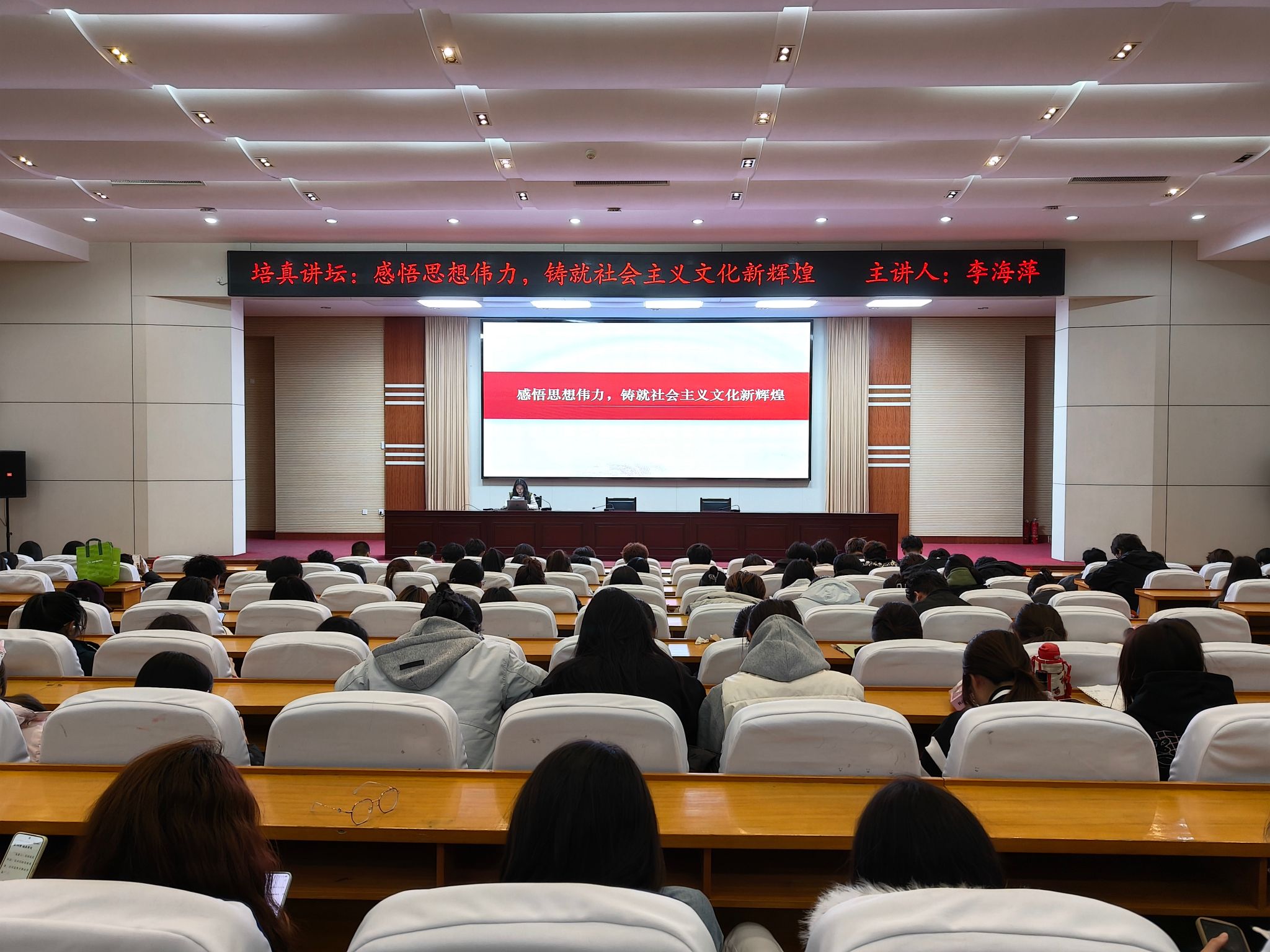 李海萍老师结合历史纵深与现实关切,紧扣“锚定根脉、服务人民、立足世界”三个维度,系统阐释了新时代新的文化使命与担当,针对“如何肩负起新的文化使命,铸就社会主义文化新辉煌”的命题,给出了深刻而清晰的回答。讲座立意高远,脉络清晰,案例生动。现场气氛热烈,师生互动踊跃,同学们纷纷表示受益匪浅。