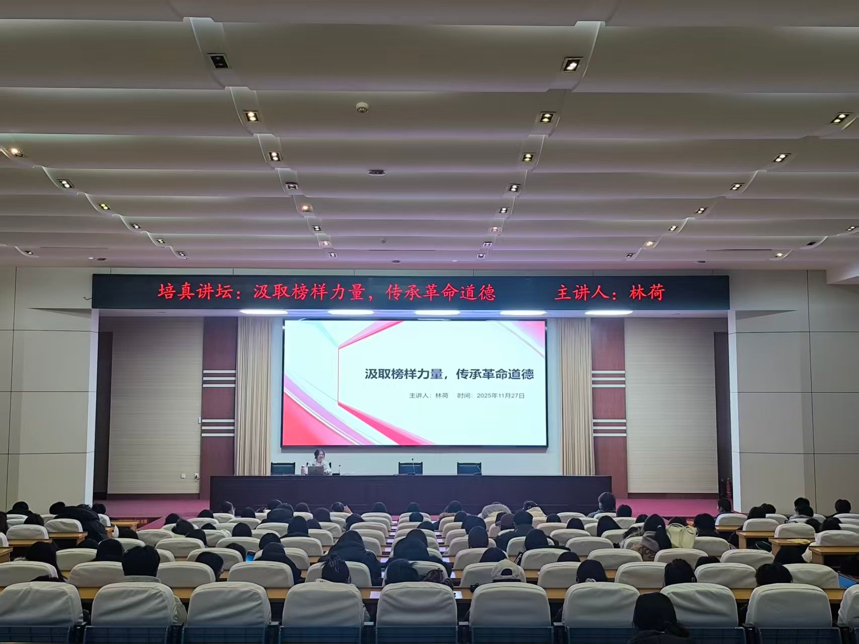 讲座中,林荷以“在物质丰裕的今天,革命精神与我们还有怎样的联系?”这一发人深省的问题切入,引导师生深入思考和平年代如何赓续信仰之光、坚守精神高地。她结合方志敏、白求恩、张思德等革命先辈的感人事迹,生动再现了烽火岁月中共产党人坚定的理想信念与崇高的道德抉择,让现场听众真切感受到信仰的力量与温度。整场讲座情理交融、史料鲜活,既有思想深度,又富情感共鸣。