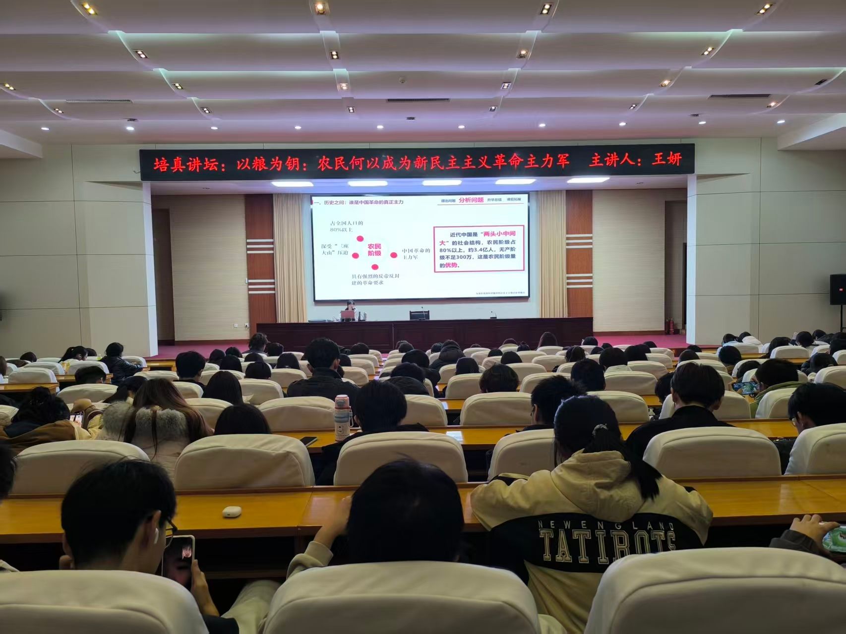 12月18日,图书信息中心在学术报告厅举办第十期“培真讲坛”文化讲座,讲座以《以粮为钥:农民何以成为新民主主义革命主力军》为主题,邀请马克思主义学院王妍老师担任主讲。
