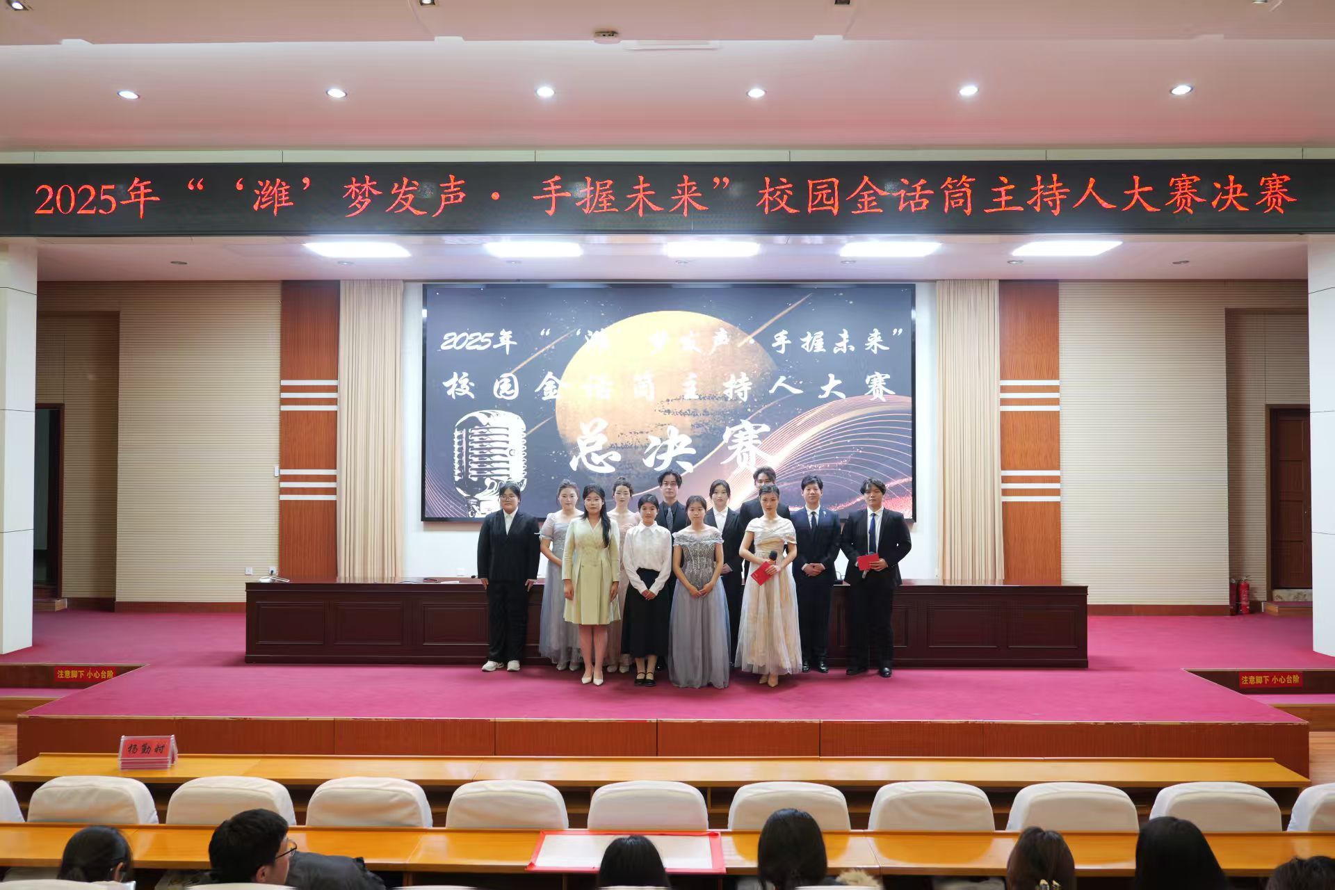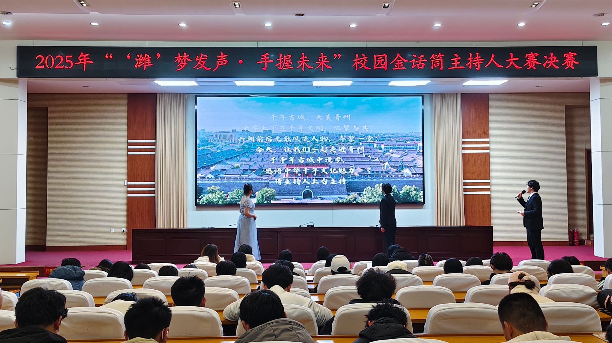 12月19日,学院“‘潍’梦发声· 手握未来”校园金话筒主持人大赛决赛在海岱阁学术报告厅举行。活动吸引了300余名师生共同观看。