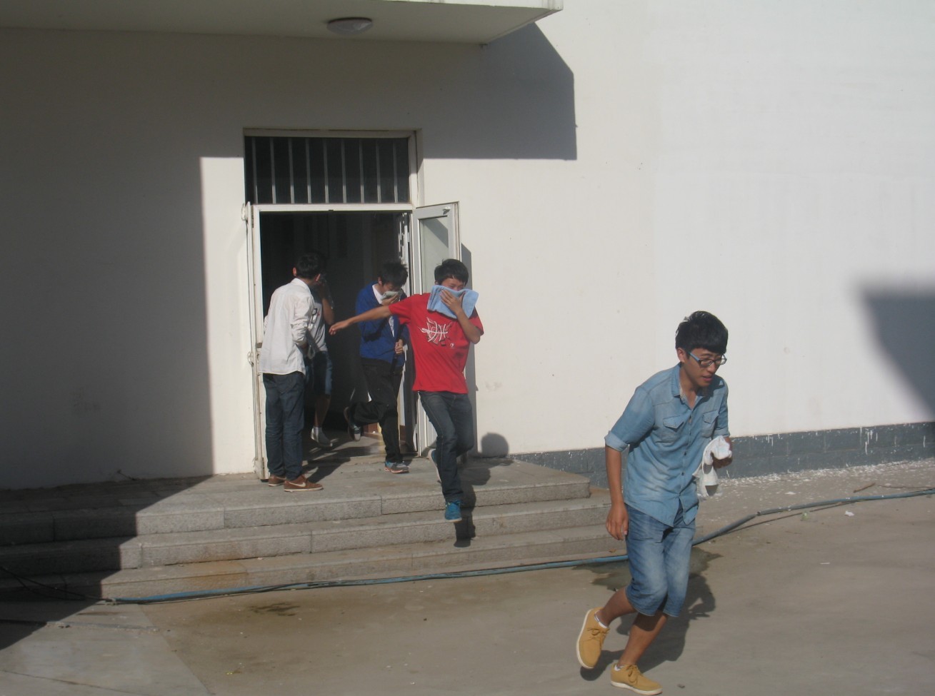 16时10分,随着代表火情发生的警哨声响,山工机电学院200余名师生在安保人员和辅导员引导下用湿毛巾捂住口鼻,从紧急疏散通道安全有序撤离。随后,消防武警第一时间从消防车上接好消防水带,携带各种装备,迅速进入现场,组织灭火行动,演练取得圆满成功。
