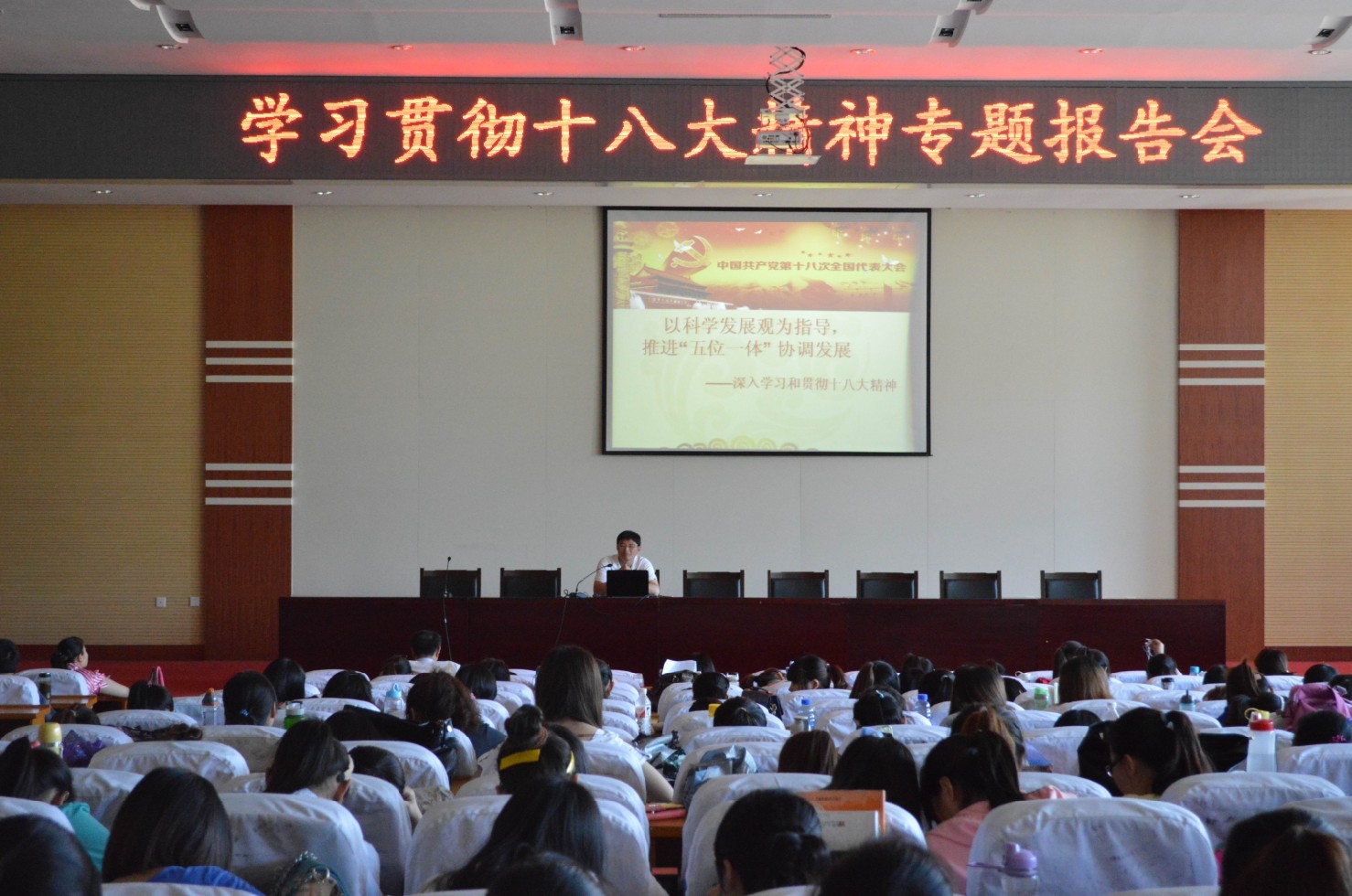 整场报告思路清晰、形象生动、关键点突出,使学生较为系统和深入地了解了十八大提出的以科学发展观为指导,推进“五位一体”协调发展的总体布局,深化了学生对党的新理论、新政策的认识和理解;同时也激发了大学生关心国家大事,学习党的方针政策的积极性。