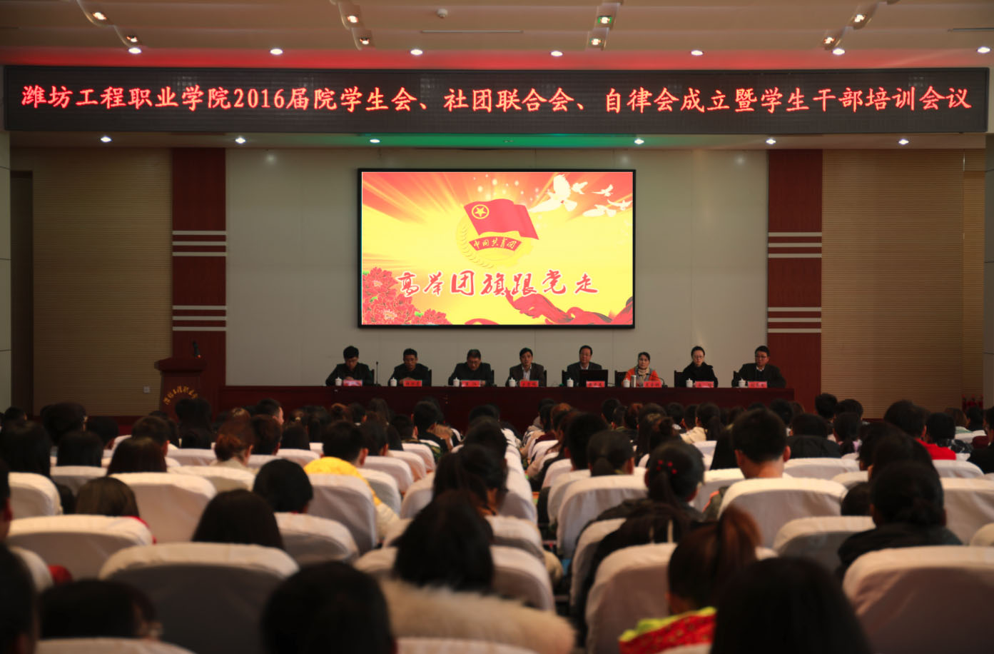 11月10日下午,学院2016届学生会、社团联合会、自律会成立暨学生干部培训会议在学术报告厅隆重举行。学院副院长王金明出席会议并讲话,信息工程系主任安庆森为学生干部们做了题为《努力做一个好的学生干部》的报告,团委学生处负责人、各系(院)团总支书记参加会议,近500名学生干部代表参加了培训。会议由团委学生处处长翟江主持。