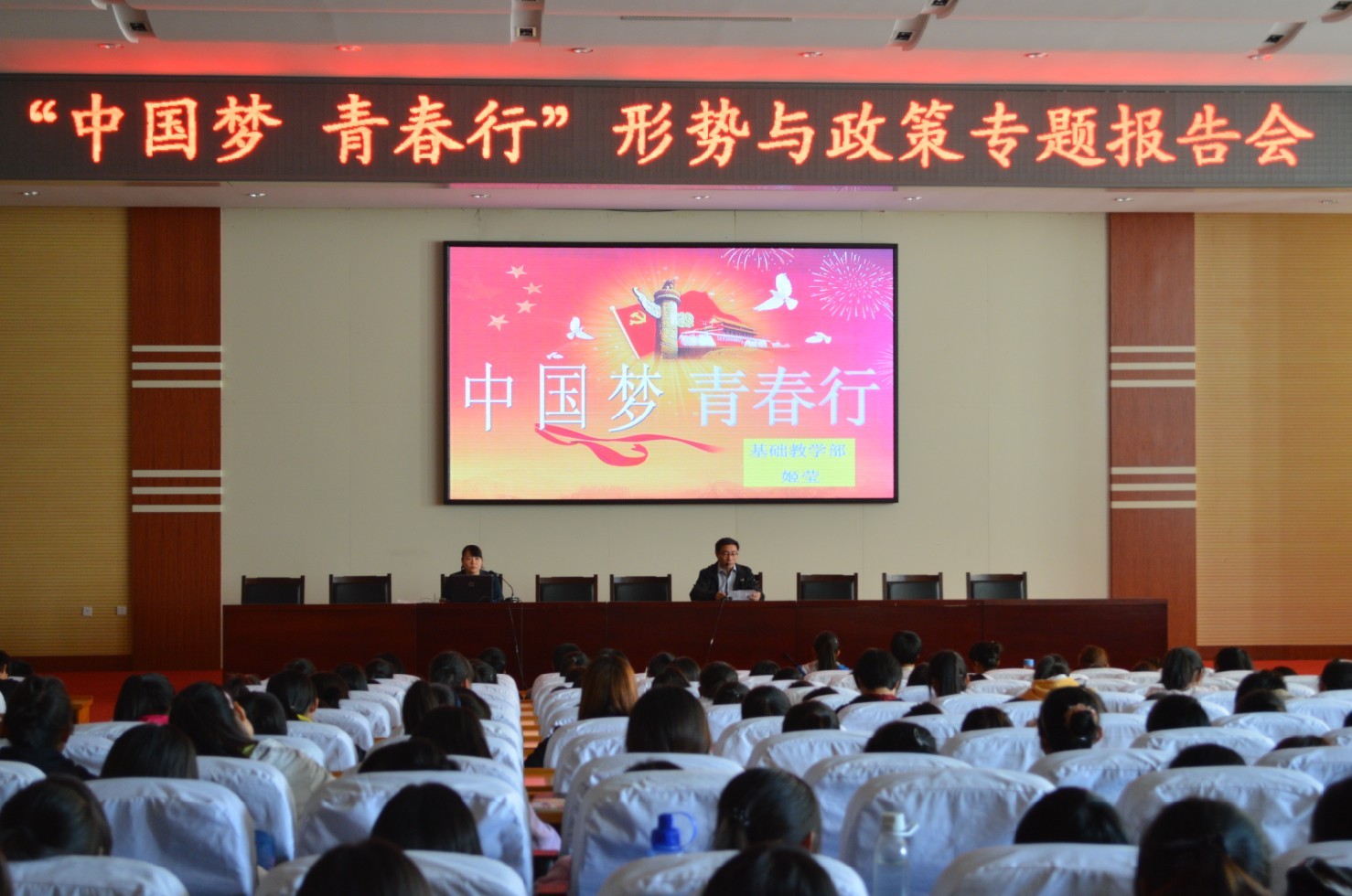 10月17日下午,基础教学部在学术报告厅举办了题为“中国梦 青春行”的形势与政策专题报告会。报告由基础教学部教师姬莹主讲,各院系2013级学生代表和辅导员老师参加报告会。