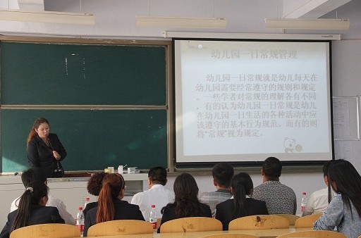 在5号教学楼5201多媒体教室,青州市金翅膀幼教集团总园长曹金环博士为学前教育学院全体教师和部分学生作专题报告。她采用体验式、互动式的培训形式,用幽默的语言和新颖的游戏调动参训者主动参与的积极性,让参训师生意识到什么是团队精神,如何克服恐惧、提高自信,赋予了参训人员“用生命影响生命”的亲身体验与真实感受。报告会上,她还用视频、图文等多种形式,生动地介绍了幼儿园的一日生活常规,探讨了每项常规的教育意义。