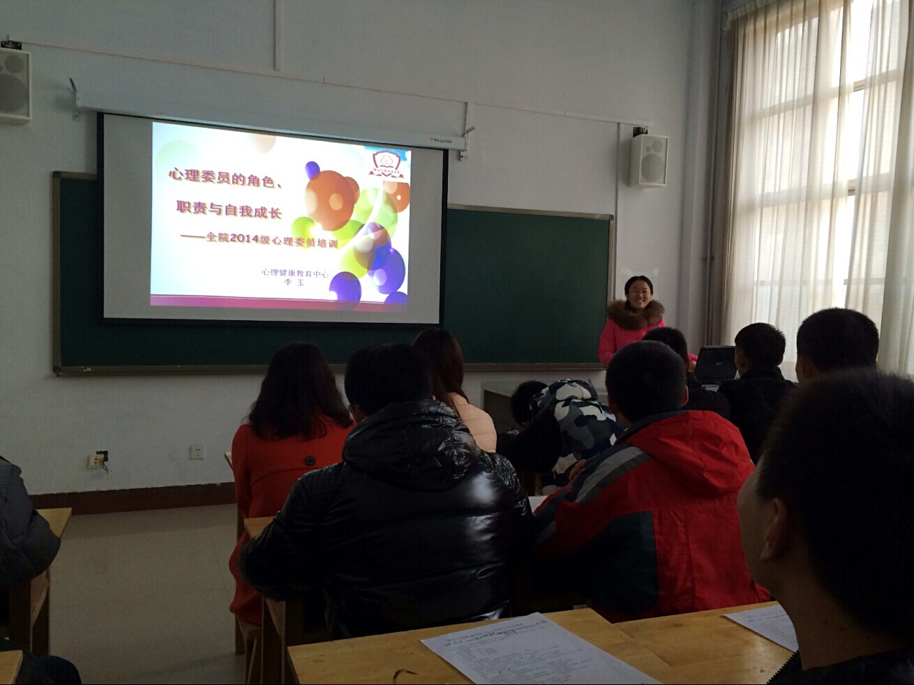 为提高我院大学生的心理健康意识与综合素质能力,12月4日,基础教学部心理健康教育中心教师李玉在第二教学楼202教室作“心理委员的角色、职责与自我成长”的报告,全院2014级心理委员参加了本次培训。
