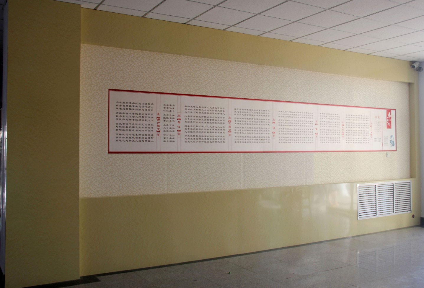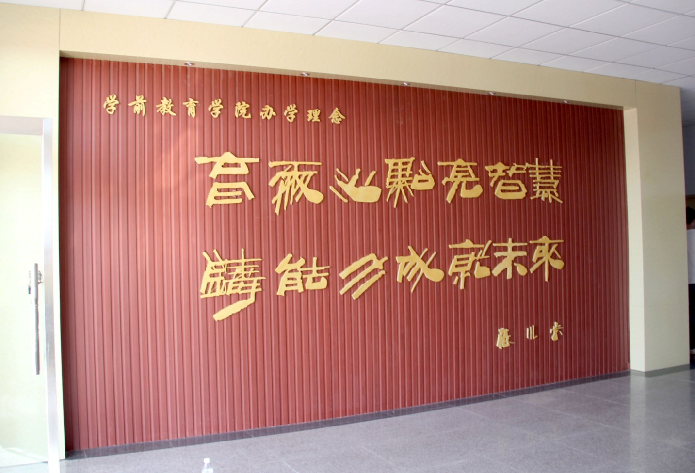 一楼大厅左侧展示的是学前教育学院的办学理念“育爱心点亮智慧,铸能力成就未来”。右侧为中国传统文化《弟子规》,是集孔孟思想之教育读物,谈及道德教育深入浅出,明确指出了为人处世应具备的礼仪与规范。走廊中展示《二十四孝图》更是能体现出中华传统美德的标准,提醒同学们在专业学习的同时勿忘学习立身做人的道理。