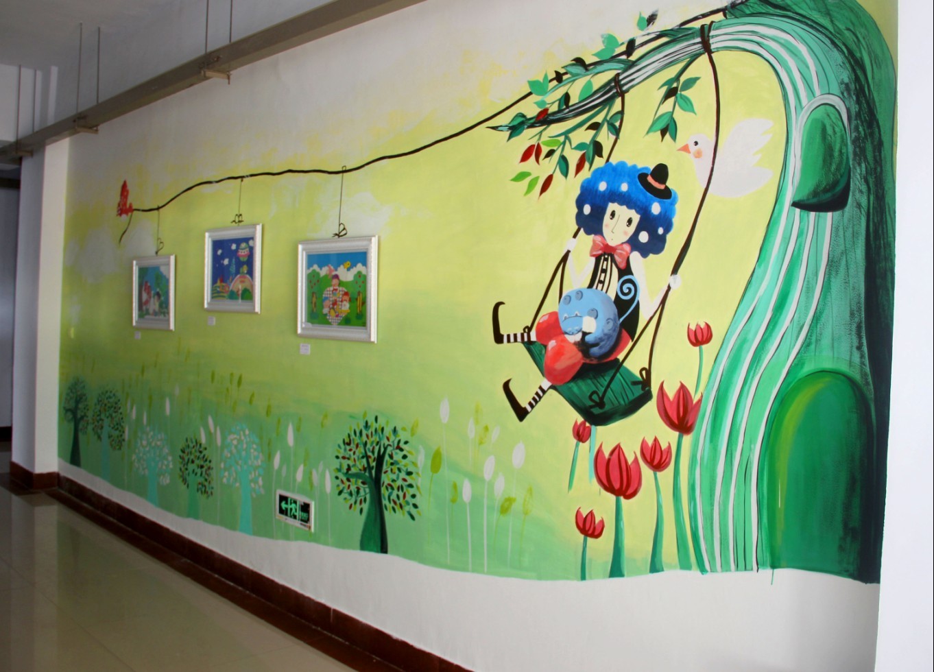 三至四楼展示了学生的《卡拼画》和《简笔画》作品。还有一面学生绘制的手绘墙作品,色彩清新雅致,形象栩栩如生,在构图设计上与学生的卡拼作品遥相呼应,更是具有独特的创意魅力。这些作品展现了学前教育特色,也体现出教学做一体化的教学模式。