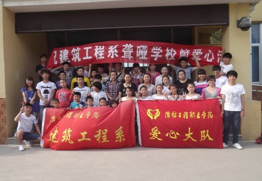 5月23日,建筑工程系团总支学生会组织志愿者来到青州市特殊教育学校,与学校里的孩子们一起交流,帮助他们解决生活上的问题,派发学习用品和体育用品,与他们展开各种形式上的小活动,表达对他们的关心。活动中志愿者们纷纷表示,只要为聋哑儿童付出更多一些志愿服务,一定能撑开一片明媚的蓝天,用我们的爱,让他们天真的笑容重现脸上,让爱心充满每一个角落。