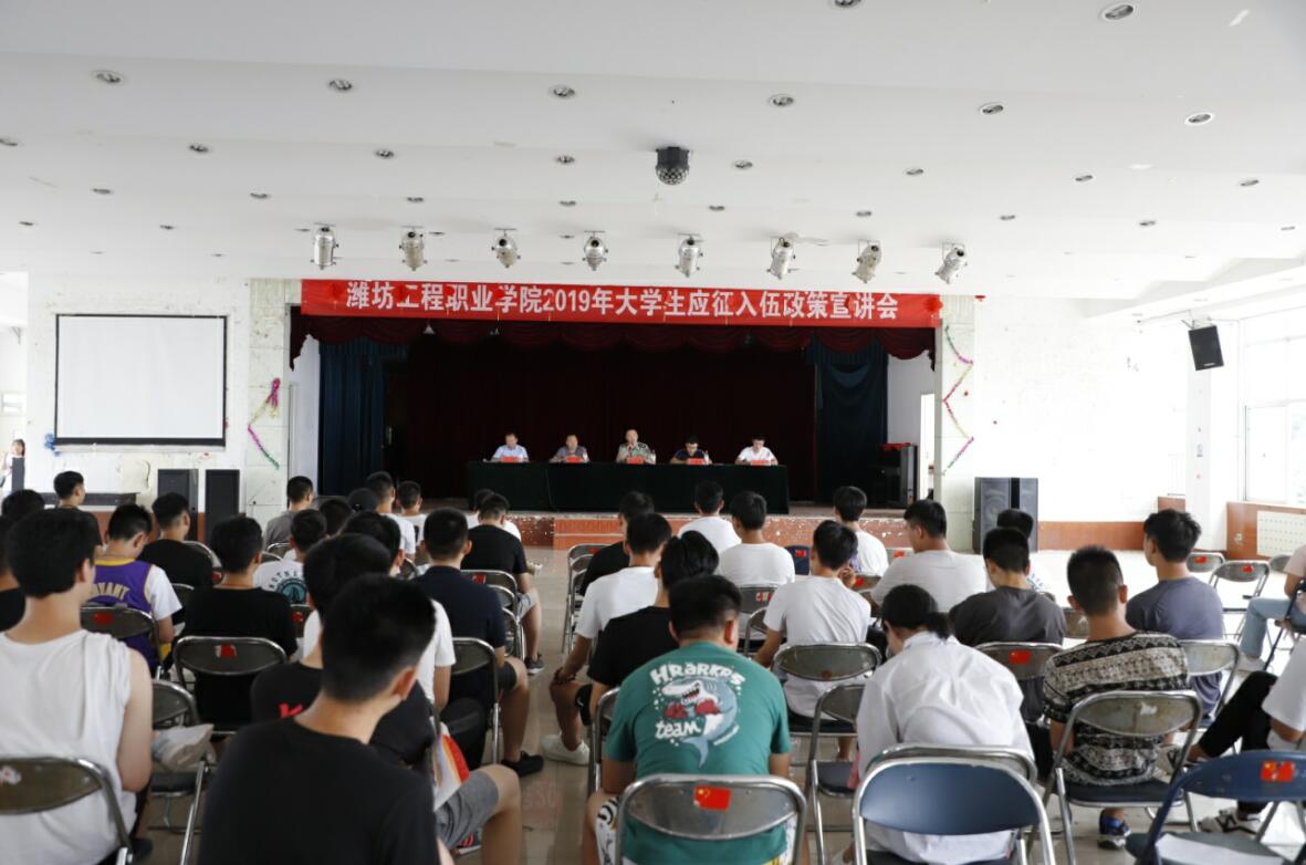 为积极贯彻落实军委国防动员部、教育部2019年全国大学生征兵工作网络视频会议精神以及山东省、潍坊市大学生征兵工作会议要求,6月13日下午,潍坊工程职业学院2019年大学生征兵政策宣讲会在大学生活动中心举行。本次会议邀请了青州市人民武装部慈博宇参谋为学生进行征兵政策解读及国防动员。团委学生处、大学生征兵工作站相关负责人、部分义务征兵宣传员出席活动。