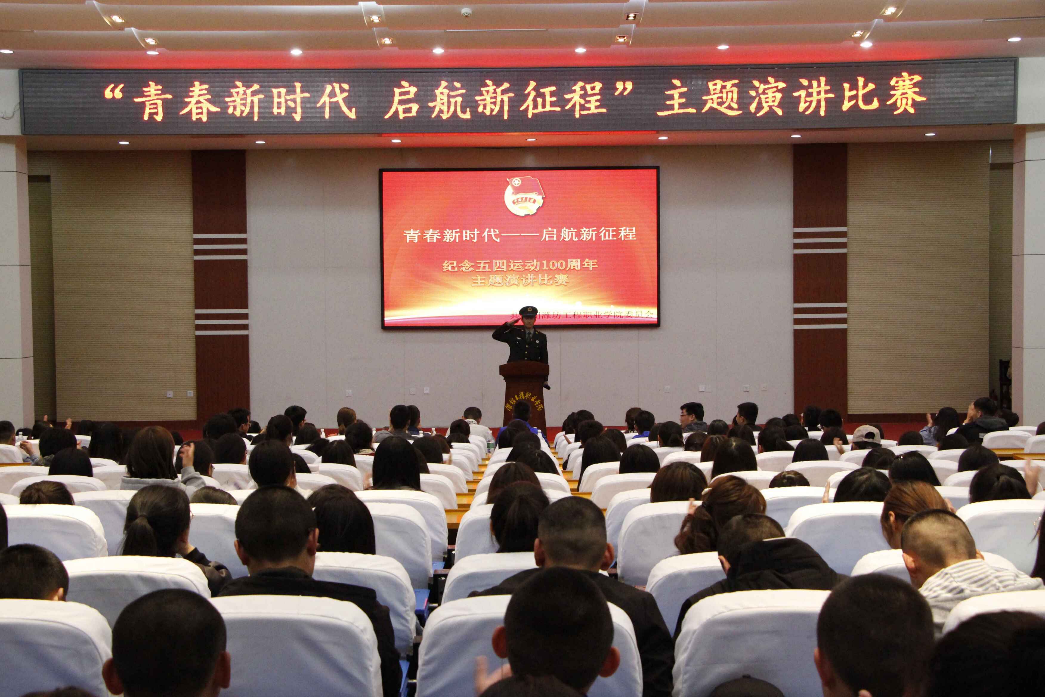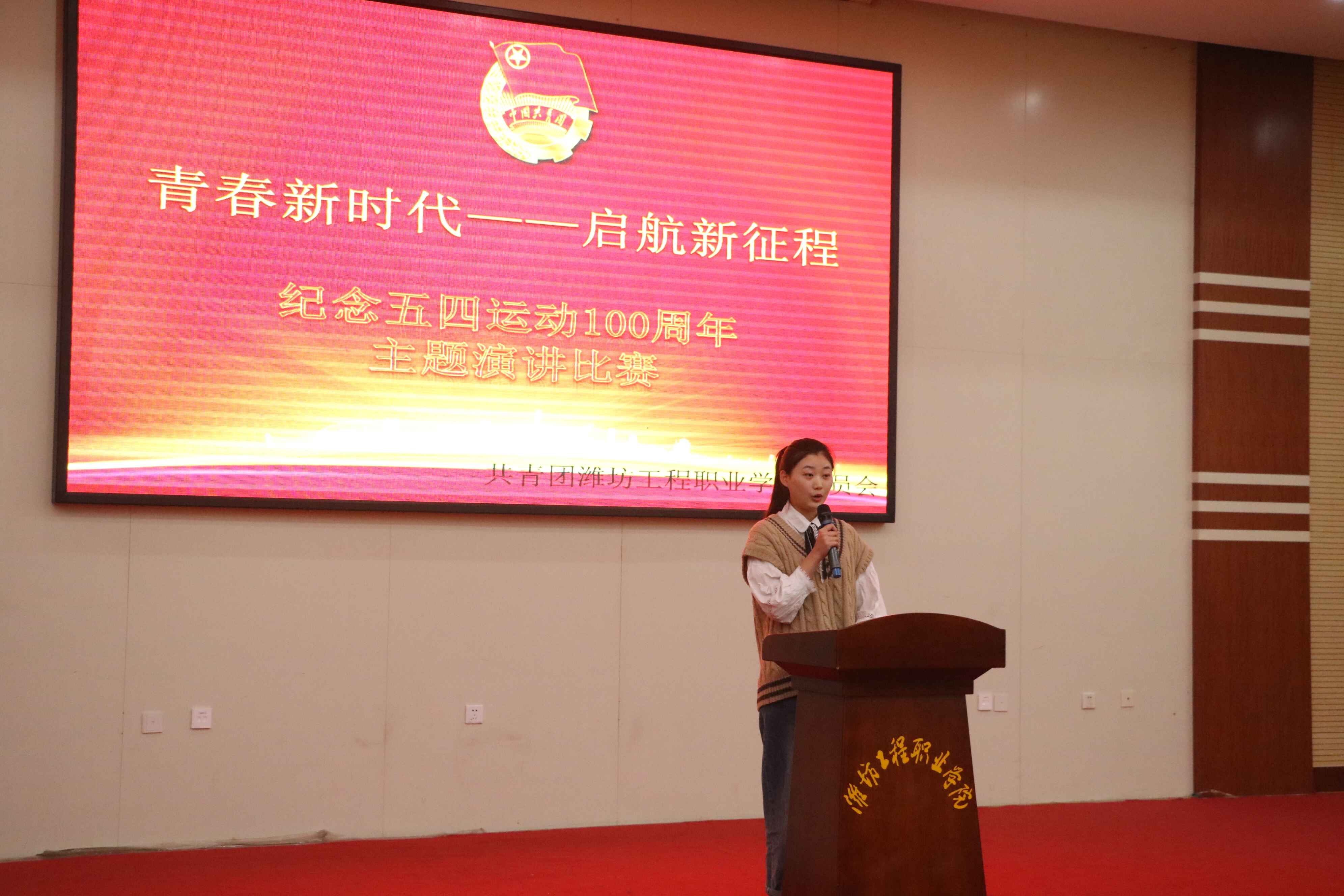为纪念五四运动100周年、共青团建团97周年,近日,由共青团潍坊工程职业学院委员会主办、社团联合会和演讲与口才协会承办的“青春新时代、启航新征程”主题演讲比赛决赛在报告厅顺利举行。