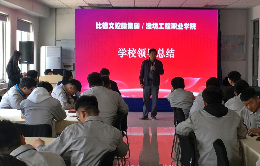 4月18日,汽车工程系现代学徒制班“工学交替”表彰大会在昌乐比德文控股集团礼堂隆重举行。汽车工程系相关负责人及多名教师、2017级汽车检测与维修现代学徒班46名同学、比德文控股集团有限公司相关人员参加活动。