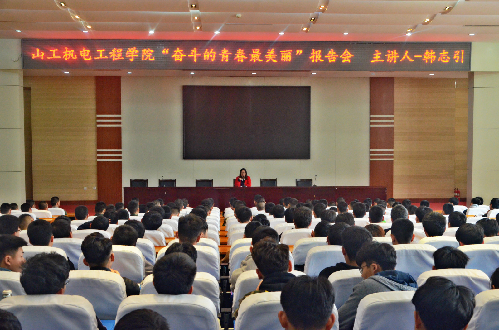 3月28日,山工机电工程学院在学术报告厅举办 “奋斗的青春最美丽”专题报告会。邀请全国高校青年教师教学竞赛工科组一等奖获得者、省职业教育青年技能名师、省富民兴鲁劳动奖章获得者、省教育工会女职工建功立业标兵韩志引老师为山工机电工程学院2018级同学作报告。